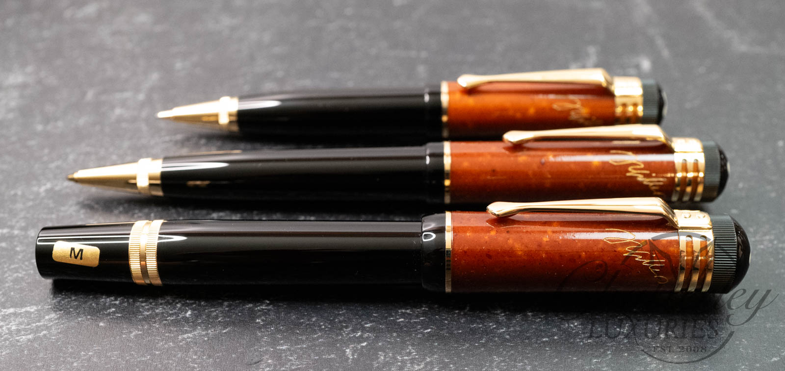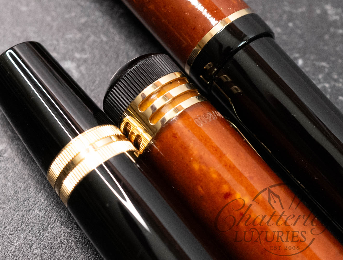 This pen set is lovingly used and comes complete with the original box and papers. The Fountain Pen is equipped with an 18k Medium nib and fills via a piston filling system. The set also includes a ballpoint pen and mechanical pencil, both in working order.