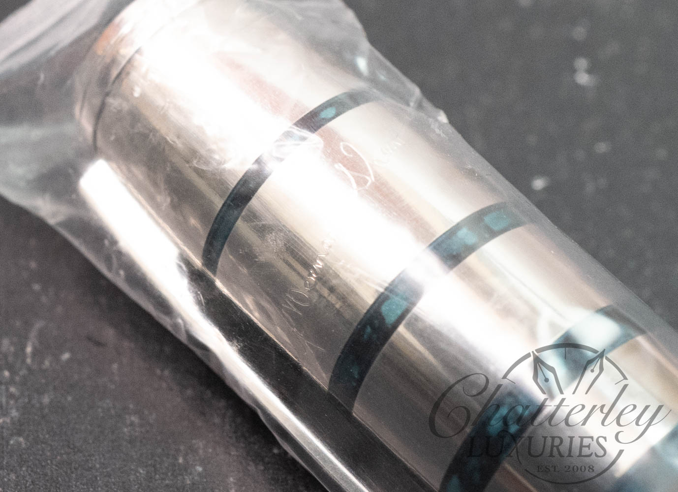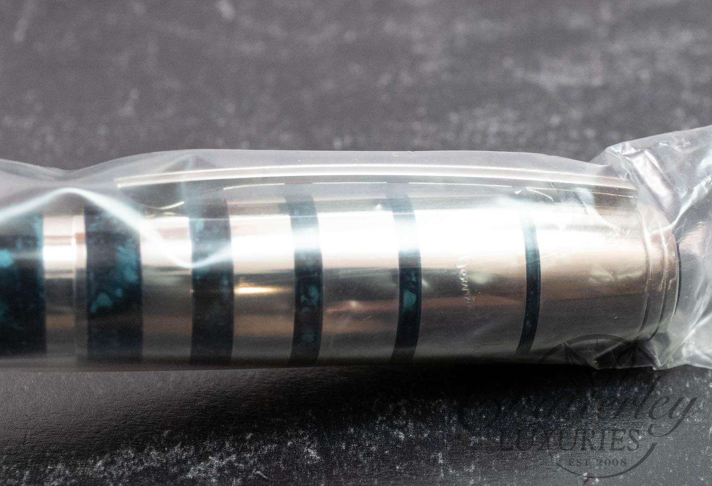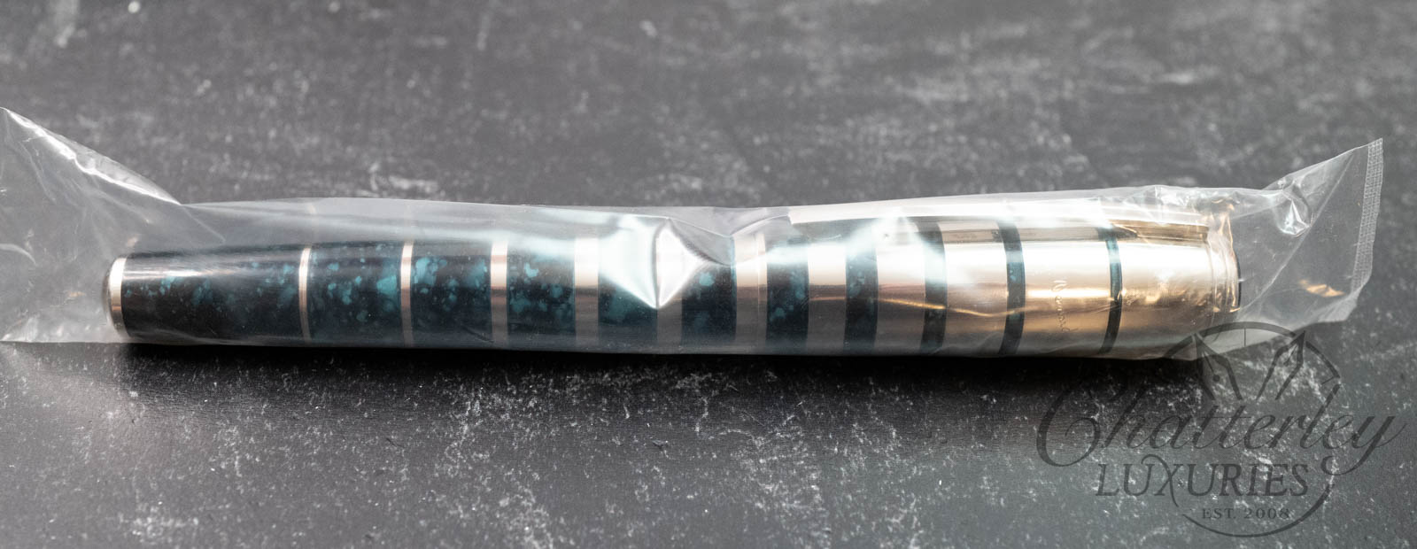 This fountain pen is a New Old Stock pen that has never been opened, it is still in the sealed plastic casing. It is equipped with an 18k Medium nib and fills via a piston filling system.