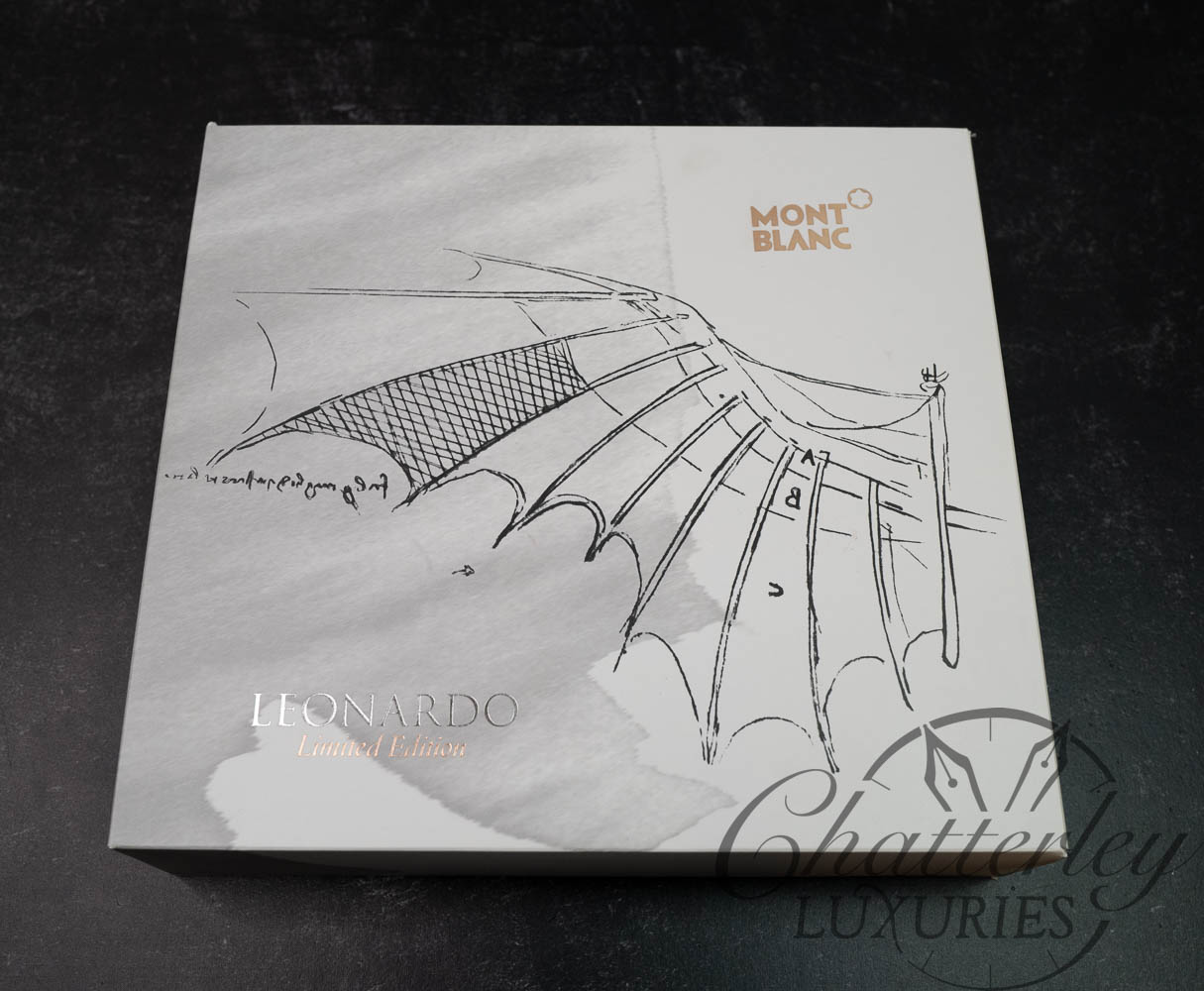 Created to honour this world-renowned genius of the Renaissance, the Limited Edition Leonardo features a silver-coloured, anodised cap and barrel with highly polished platinum-plated fittings. Â Every detail of the design corresponds directly to Leonardo’s original sketches of flying machines and mechanical constructions. Â The wedge shapes recall Leonardo’s method of connecting mechanical parts. Â The gear decorations on the cone, as well as the rotating gear on the clip, reflect his numerous inventions driven by gears. Â The engraved wing sketch on the forepart and the bat on the 750 gold nib honour his study of the characteristics of flying beasts, while the mirror in the cap-top, revealing the Montblanc emblem, is a reference to his mirror studies.