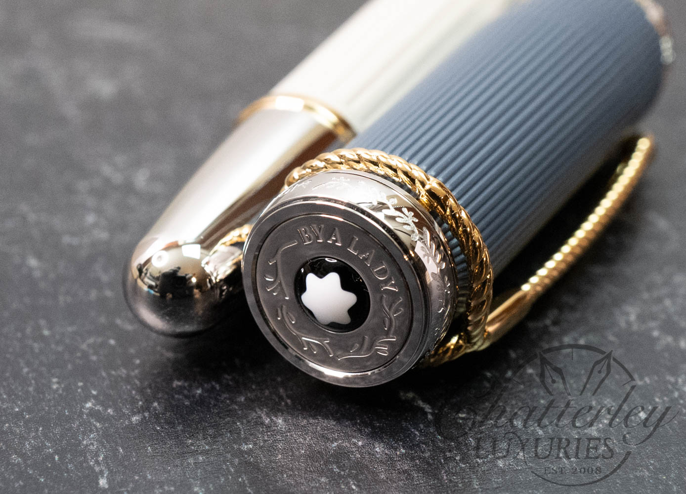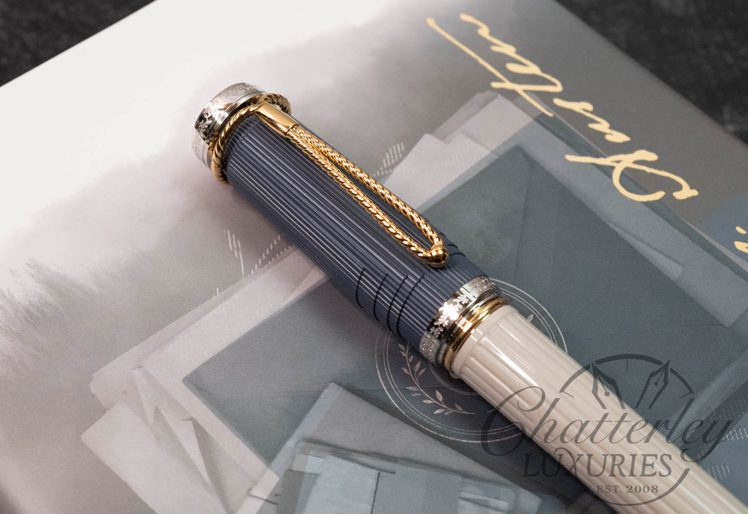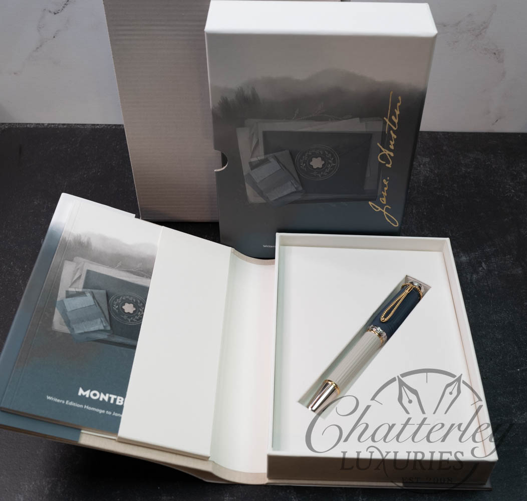 Montblanc has created the Writers Edition Homage to Jane Austen to celebrate one of English literature’s most famous authors. This edition brings to life the Regency era, when noble country estates were the scene of great parties held for the purpose of cultivating social relationships and forging marriage alliances. The fluting of a classical column embellishes the elegant sandstone-grey resin barrel, along with Jane Austen’s signature. The contrasting grey-blue cap references the type of double-collared Regency coat typically worn by gentlemen such as Mr Darcy in Pride and Prejudice.