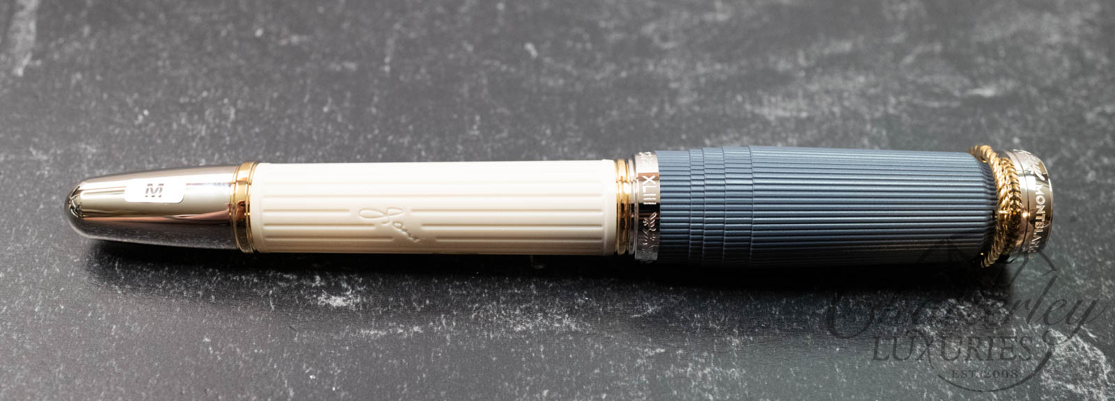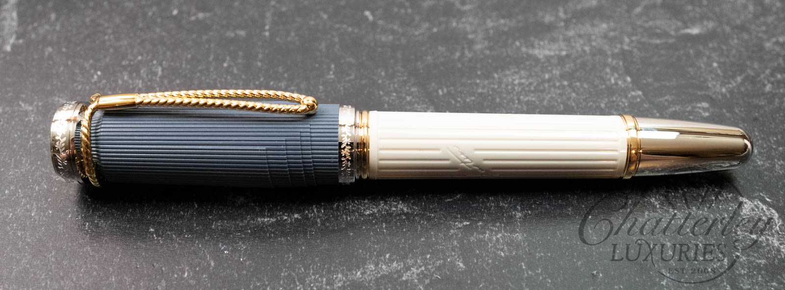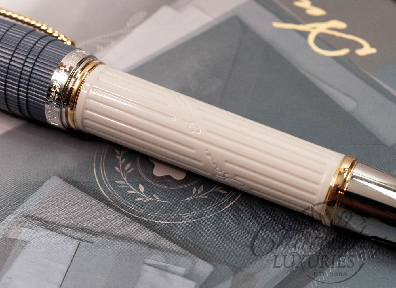 Montblanc has created the Writers Edition Homage to Jane Austen to celebrate one of English literature’s most famous authors. This edition brings to life the Regency era, when noble country estates were the scene of great parties held for the purpose of cultivating social relationships and forging marriage alliances. The fluting of a classical column embellishes the elegant sandstone-grey resin barrel, along with Jane Austen’s signature. The contrasting grey-blue cap references the type of double-collared Regency coat typically worn by gentlemen such as Mr Darcy in Pride and Prejudice.
