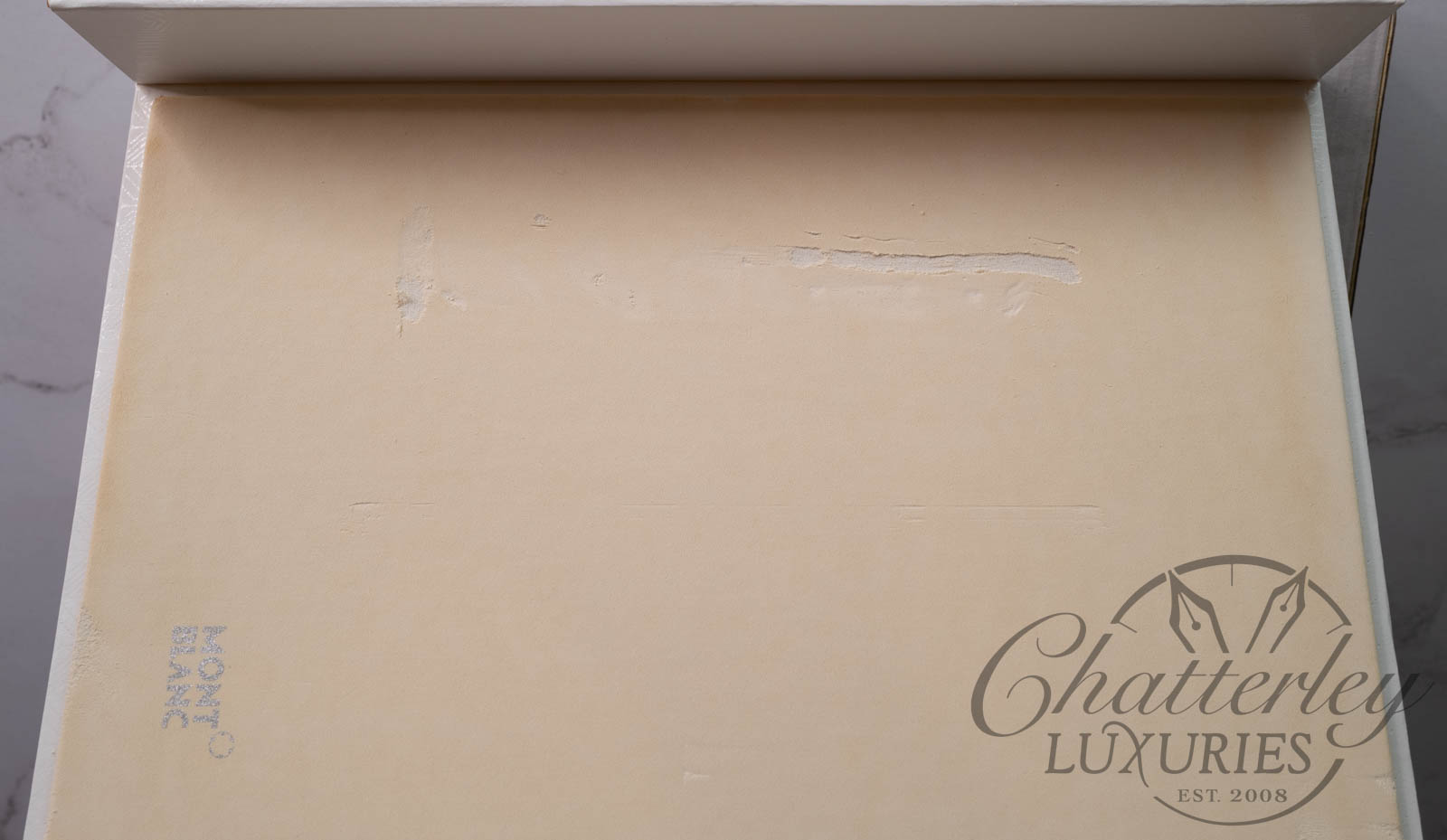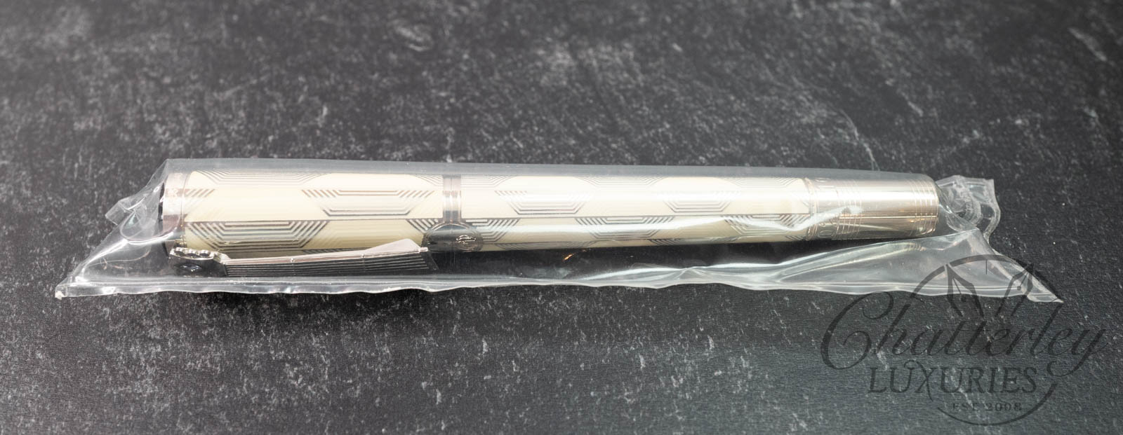 This fountain pen is a New Old Stock pen that has never been opened, it is still in its sealed casing. It is equipped with an 18k Medium nib and fills via a piston filling system. The inner box padding has begun to deteriorate in some parts (see last 2 images).