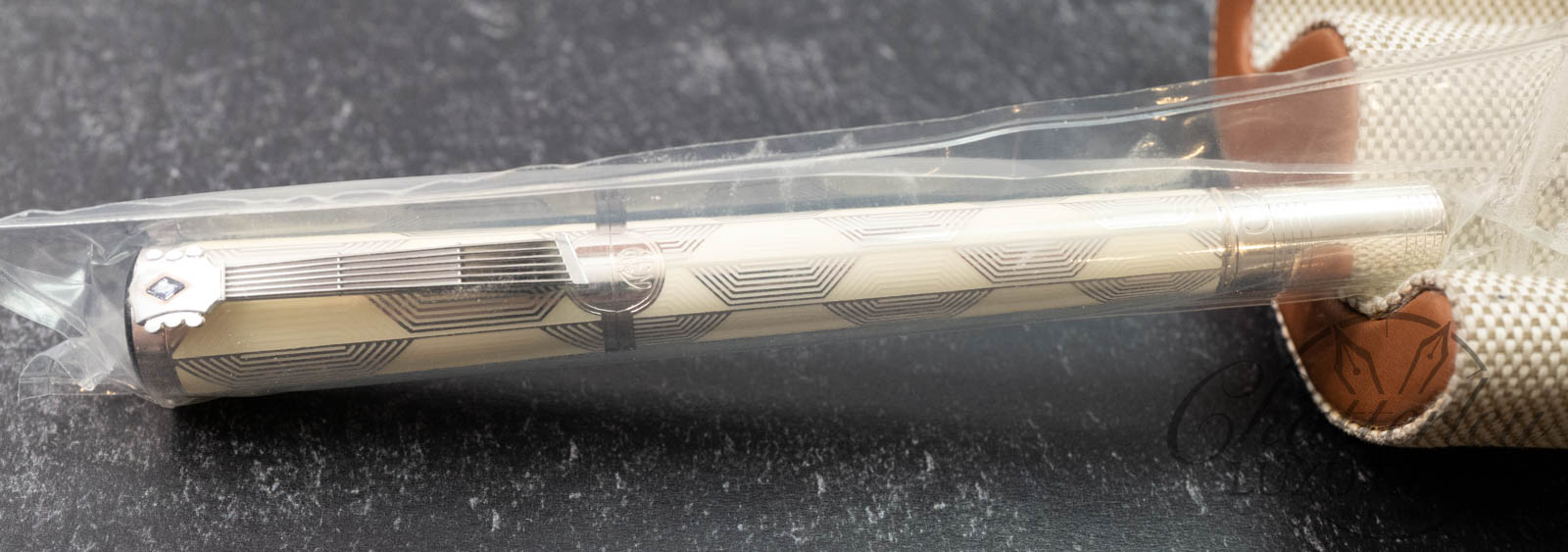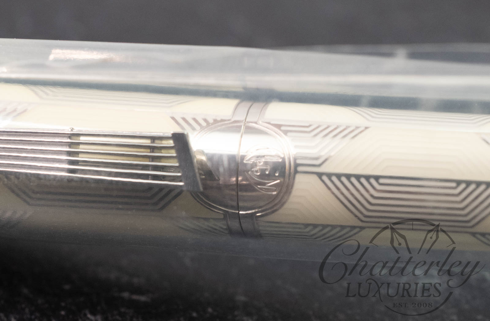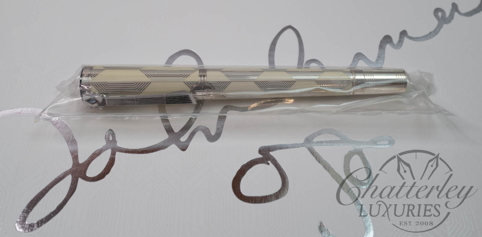 Completely covered in 925 sterling silver with guilloche and transparent white lacquer, it keeps the precious cap breakdown of the guitar-shaped clip, enriching it with a stone of blue tanzanite blue spectacles reminiscent of the famous artist. Find space along its body a number of significant recordings, including the date of publication of its greatest masterpiece: Imagine. The nib, 18K gold with rhodium finish, is once again embellished by the peace symbol.