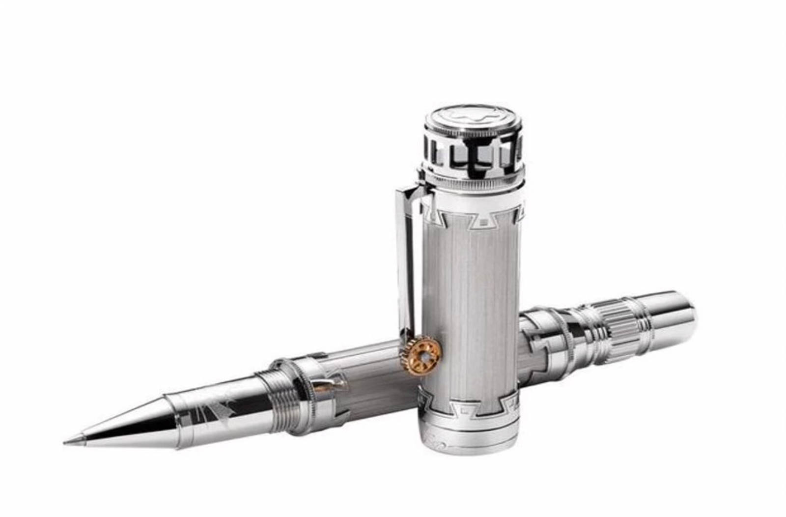 Created to honour this world-renowned genius of the Renaissance, the Limited Edition Leonardo features a silver-coloured, anodised cap and barrel with highly polished platinum-plated fittings. Â Every detail of the design corresponds directly to Leonardo’s original sketches of flying machines and mechanical constructions. Â The wedge shapes recall Leonardo’s method of connecting mechanical parts. Â The gear decorations on the cone, as well as the rotating gear on the clip, reflect his numerous inventions driven by gears. Â The engraved wing sketch on the forepart and the bat on the 750 gold nib honour his study of the characteristics of flying beasts, while the mirror in the cap-top, revealing the Montblanc emblem, is a reference to his mirror studies.