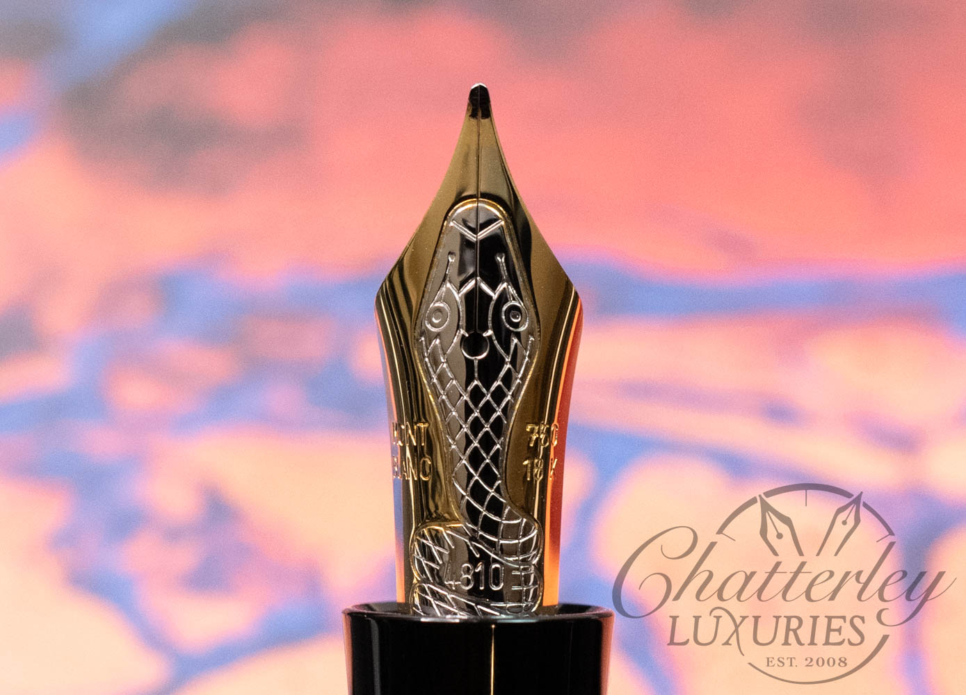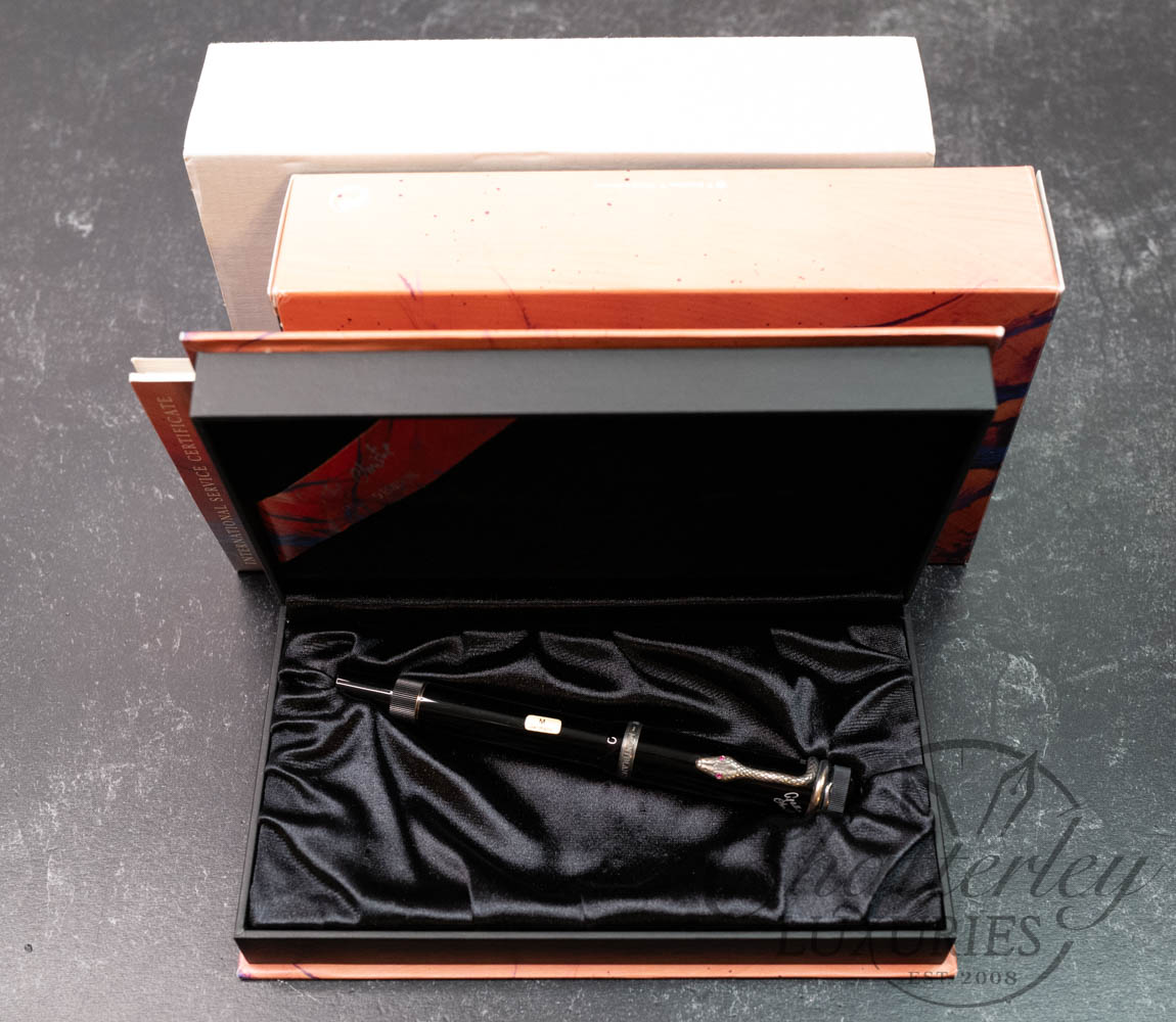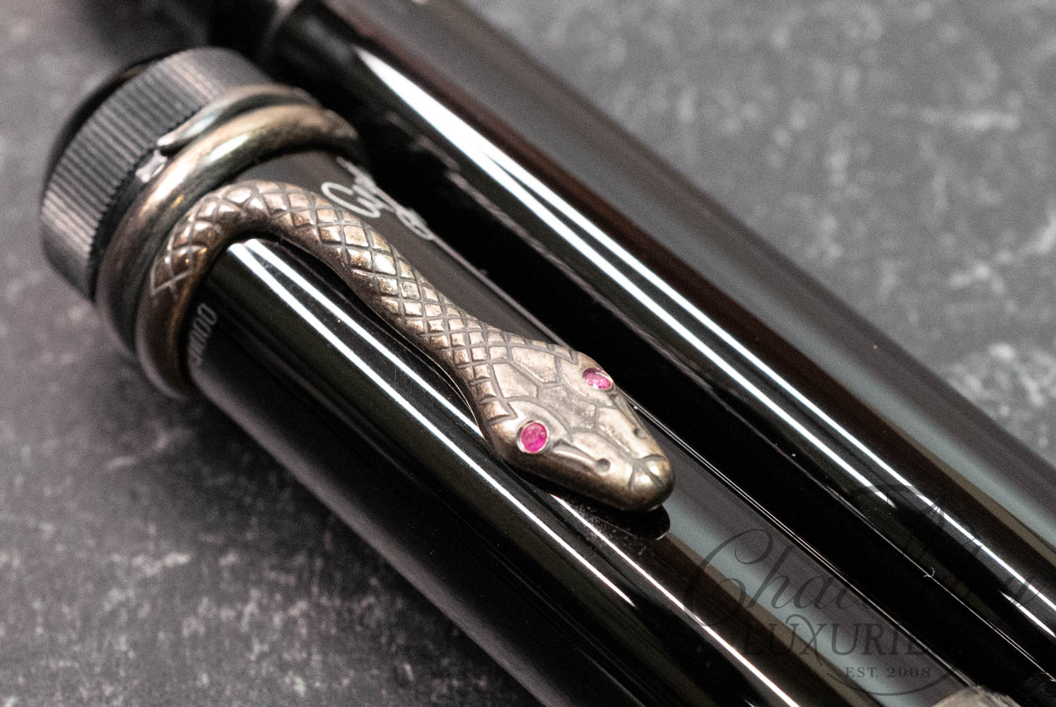 This pen is pre-owned and in near-perfect condition, it does not appear to have been inked. It comes complete with a box and papers and is equipped with an 18k Medium nib. It fills via a Piston Filling system. The pens sterling silver snake and cap clip has its original patina and we have left it in its original state so the owner can decide to polish or keep tarnished.