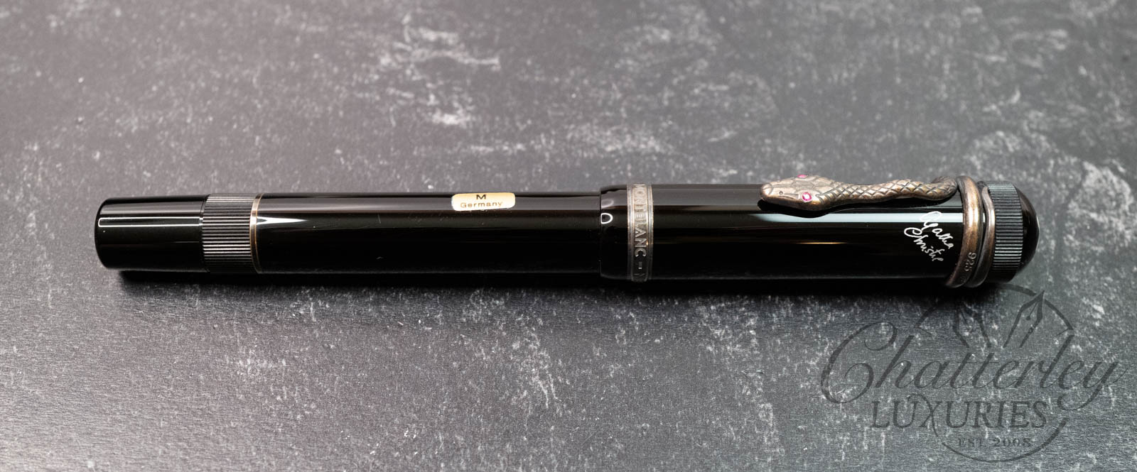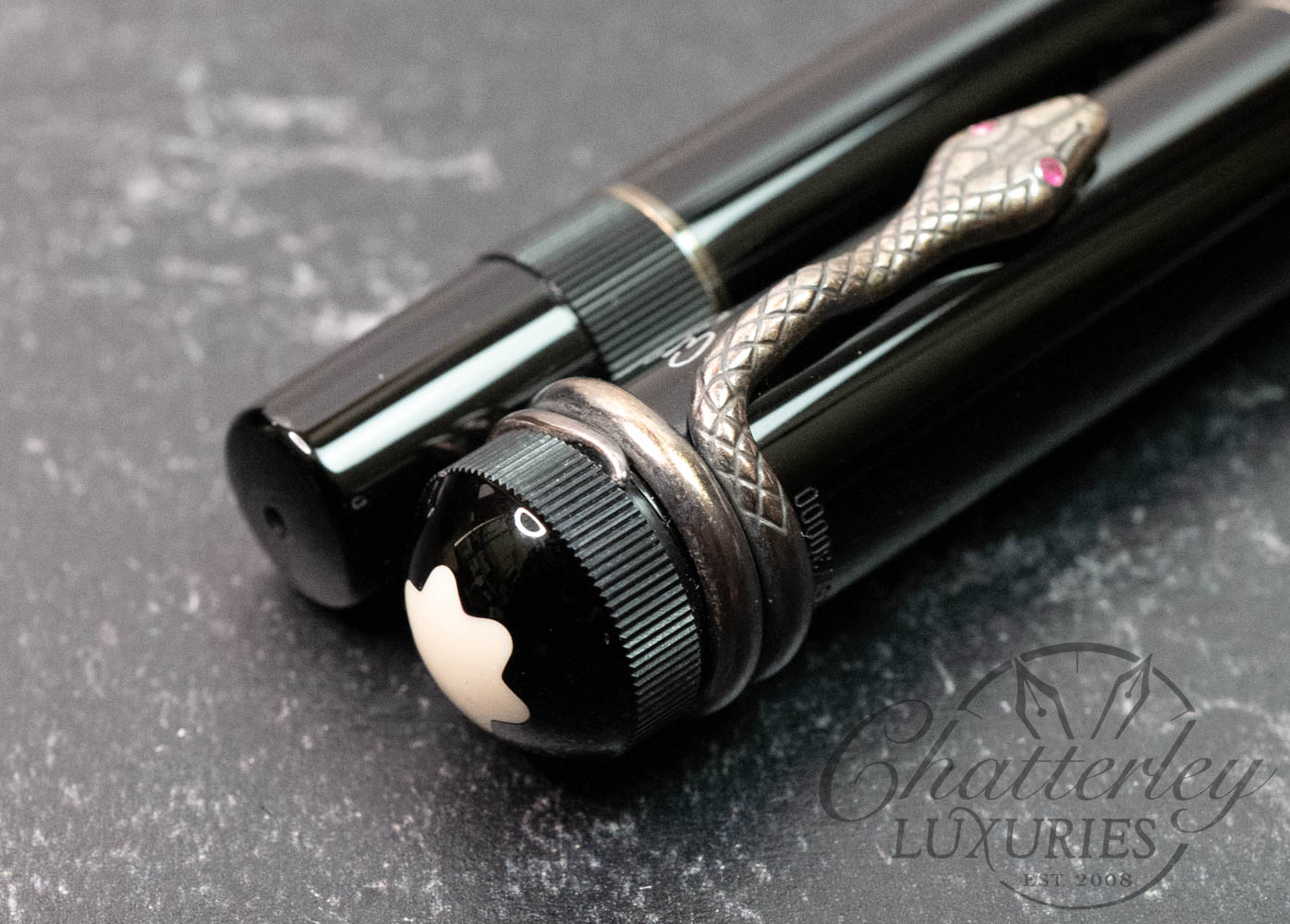 The design of the Writers Edition created in honor of Agatha Christie is based on the classic style of the early 1920’s. Around the cap, made of precious black resin, winds a snake made of 925 Sterling Silver, which hints of a creeping tension of the authors novels and serves as the clip for the pen. The eyes of the snake are set with two rubies and glint bewitchingly. .