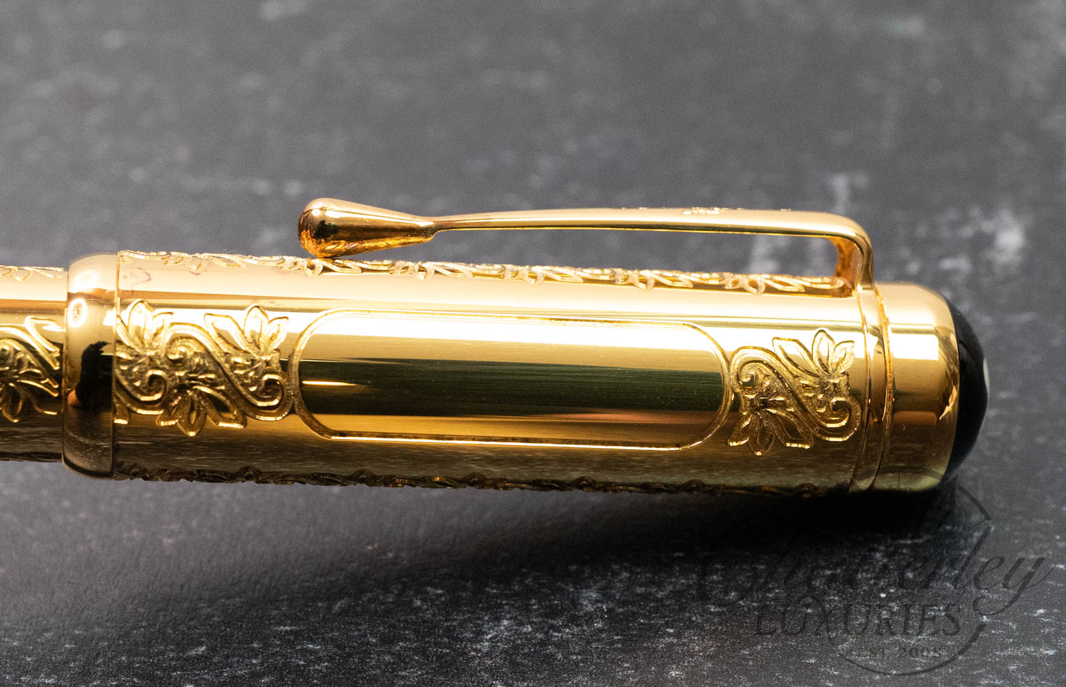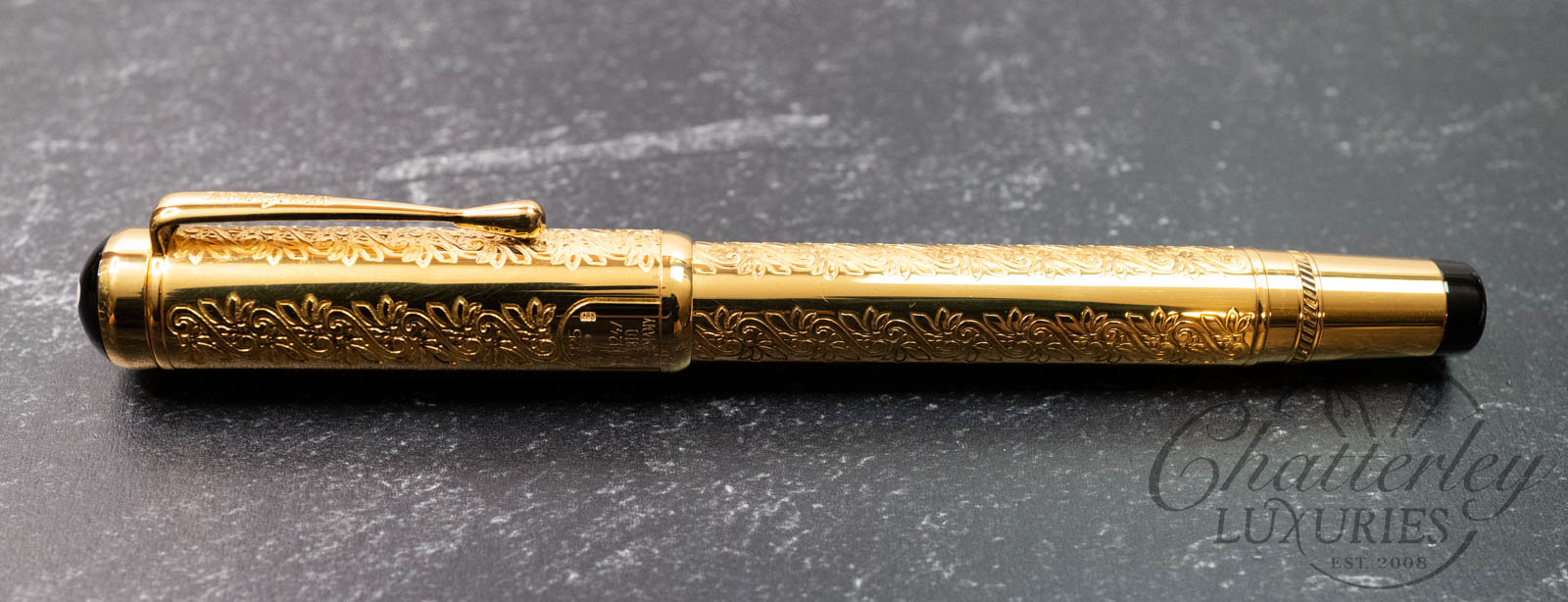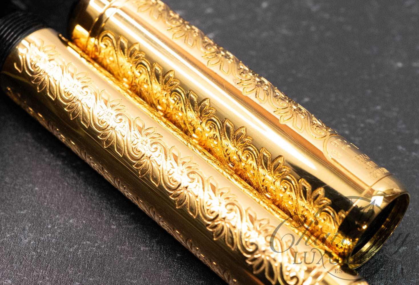 With its delicate splendour and extravagant detail, the Patron of Art Edition Louis XIV recalls the interior decoration of the rooms and salons of Versailles, the court of the Sun King. The fine barrel made of vermeil – gold-plated 925 sterling silver – is encircled with a delicate flower pattern, inspired by the world-famous gardens of Versailles.