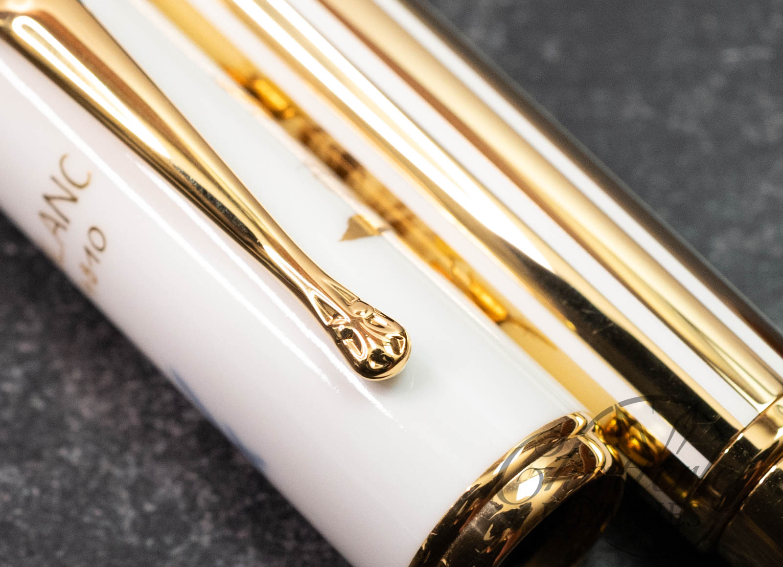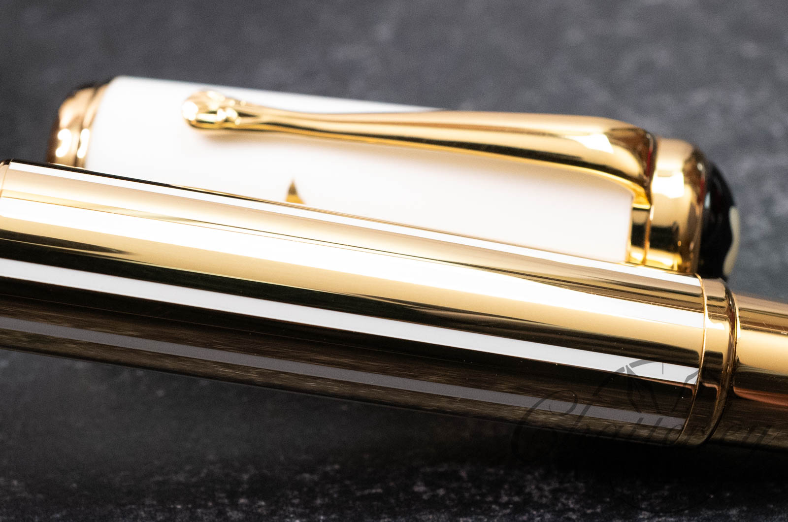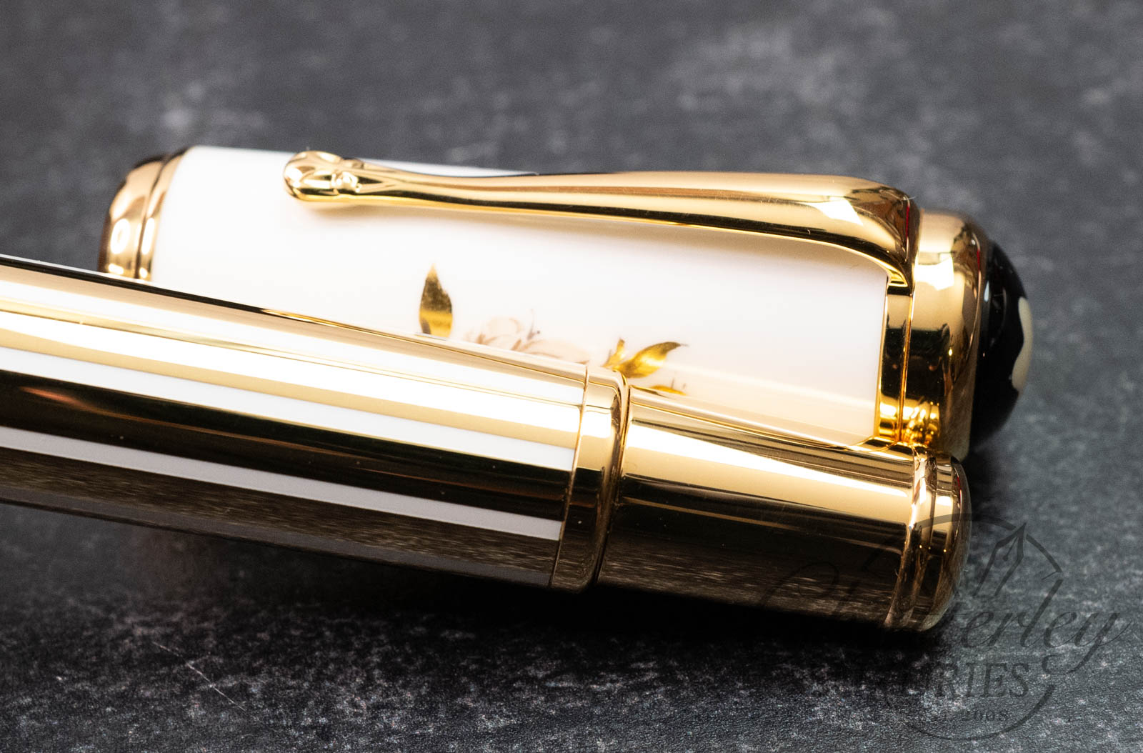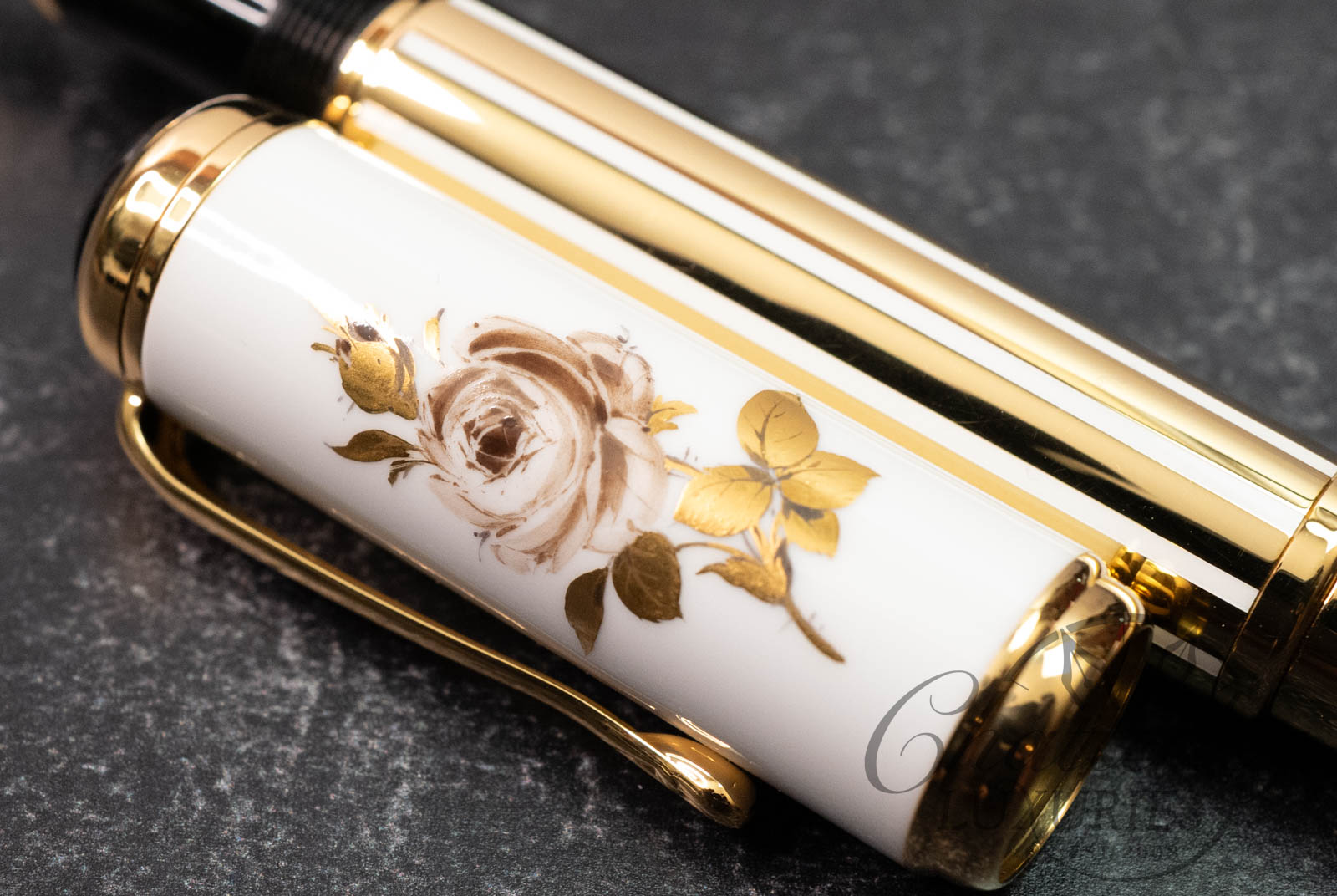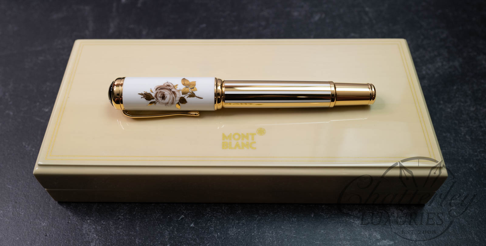 The marquise de Pompadour fountain pen with a cap made from the famous white porcelain of Meissen, adorned with a sepia-colored rose – the marquise’s favorite flower – and the traditional crossed blue swords of Meissen. The instrument also features a gold-plated barrel, a matching trim, and a gold nib.