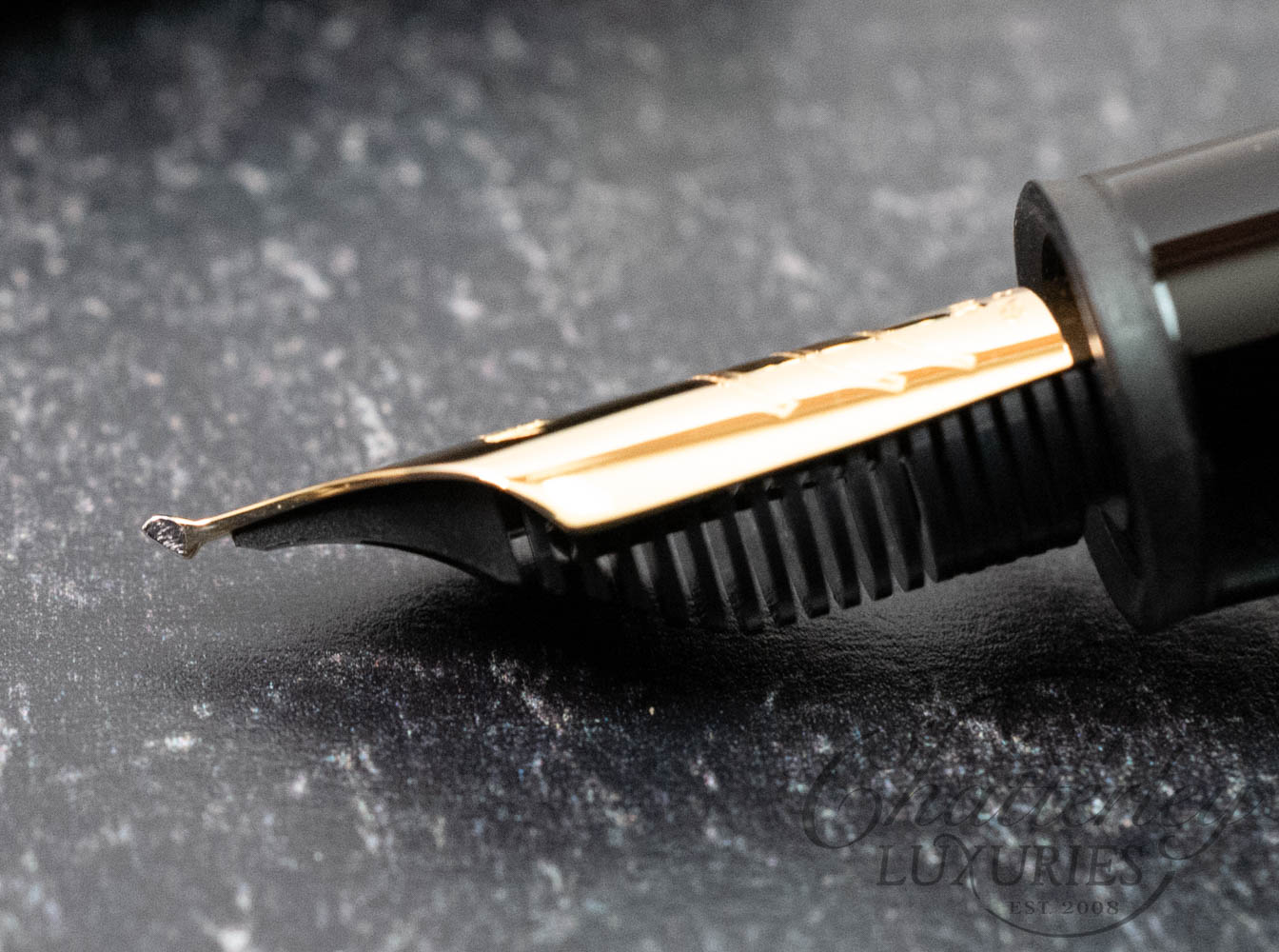 This pen is pre-owned, but in excellent condition. It comes complete with the box and papers. It is equipped with an 18k Calligraphy Curved #8 nib and fills via a Piston Filling System.