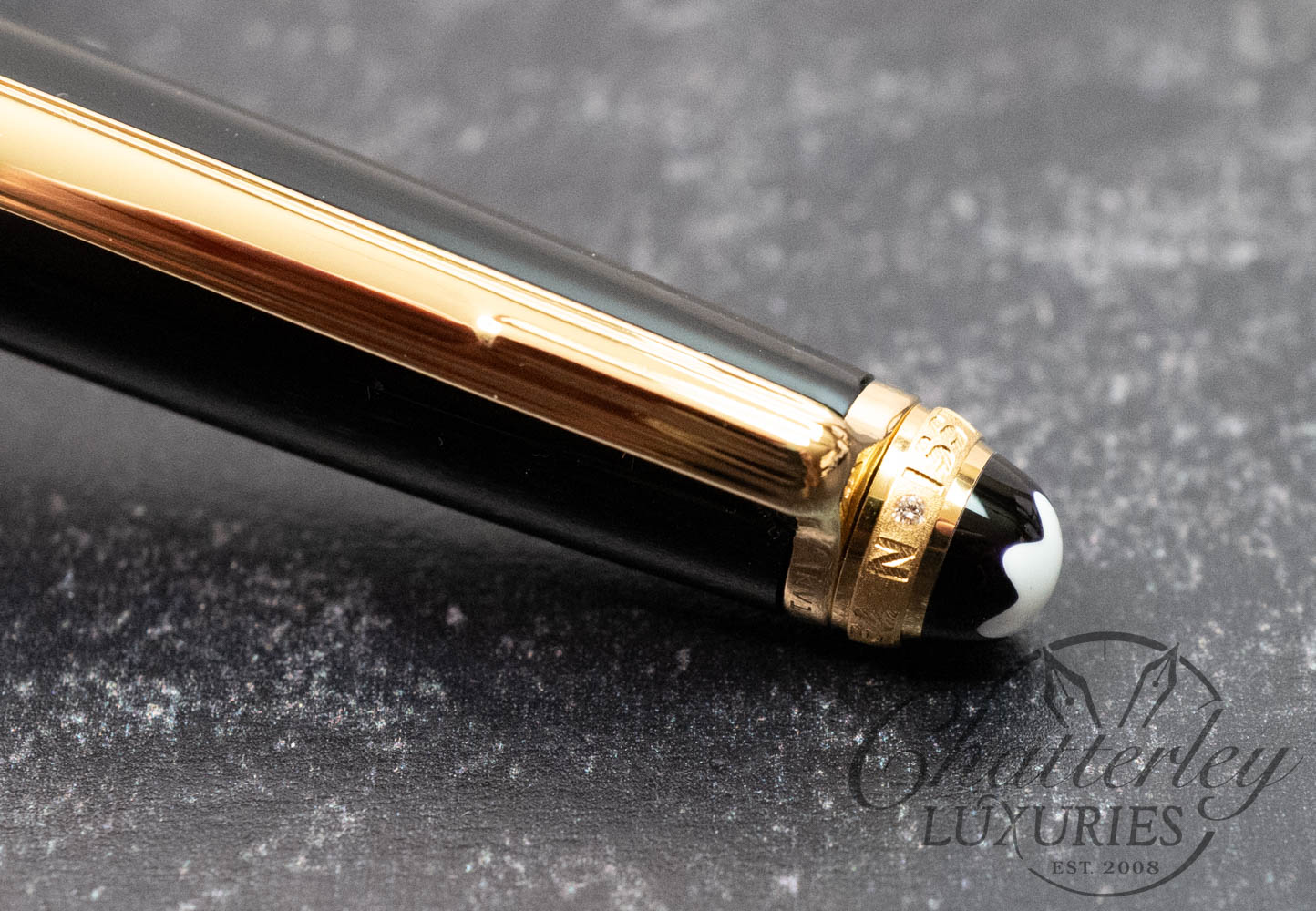 The Montblanc 75th Anniversary 164 Ballpoint pen features a gorgeous black precious resin body with gold clip and trimmings.“75 YEARS OF PASSION AND SOUL” is engraved around the gold ring at the top of the cap with a stunning diamond gently nestled in the “O” of “PASSION.” The top of the cap is adorned with the Montblanc star in the traditional white enamel.