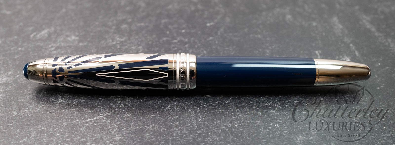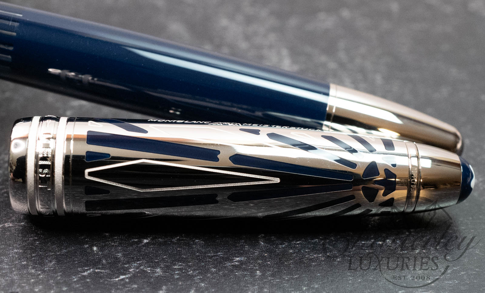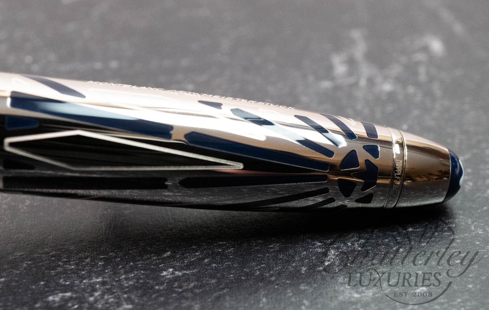 The collection draws inspiration from early designs found in our archives, as well as design features featured on the earliest Meisterstück editions, capturing the founding spirit and infusing it with a modern flair. The intricate pattern on the cap, coated with blue lacquer and platinum, harks back to an unreleased design that had been hidden away for decades, giving Montblanc the opportunity to finally introduce this long-forgotten design reminiscent of the Art Déco period.