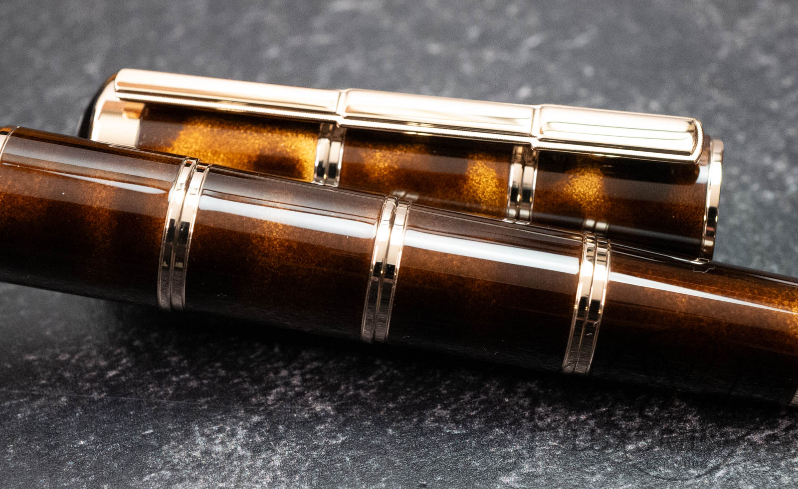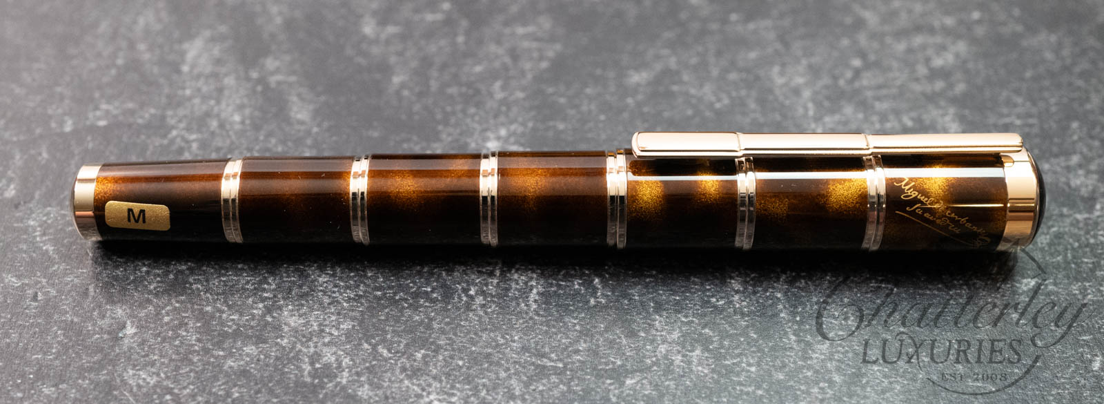 The body of the Edition shines in brown marbled lacquer and is embellished with the writers signature. The handmade solid 18kt gold nib is delicately engraved with the outline of a windmill.