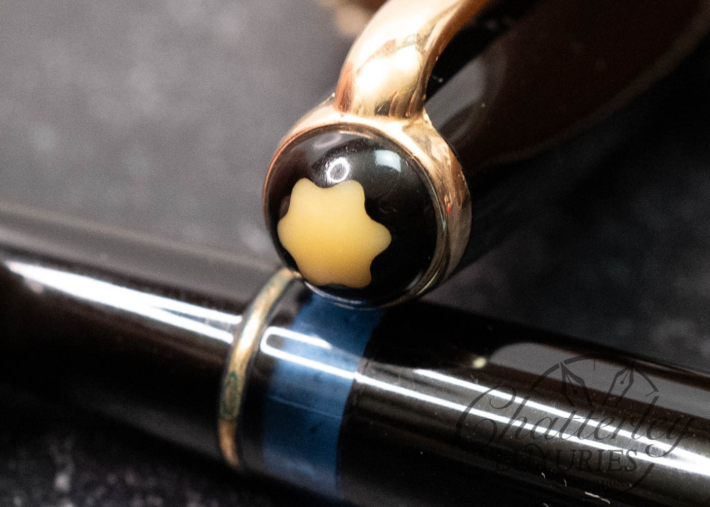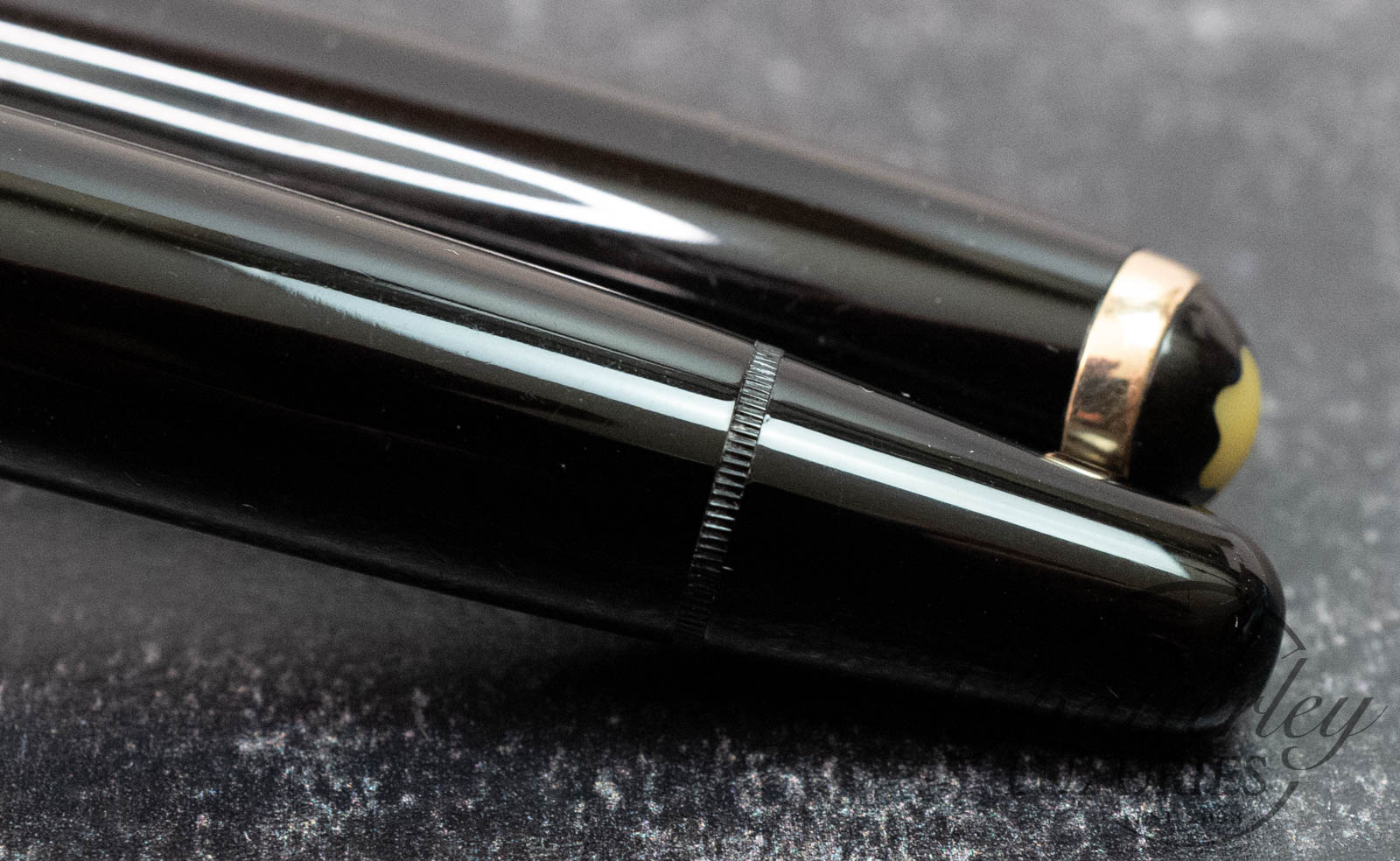 This pen is lovingly used and does not come with a box or papers. It is equipped with a 14k Oblique Broad nib with Stub-like features and fills via a Piston Filling System. There is a small dent on the side of the cap (see last image)