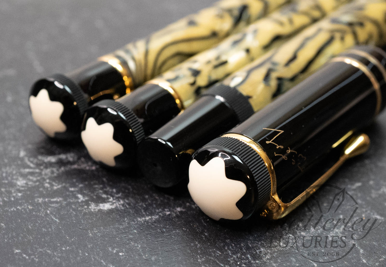 This pen set is a New Old Stock set that has never been opened, it is still sealed. The Fountain Pen is equipped with an 18k Medium nib and fills via a piston filling system. The set also includes a ballpoint pen and mechanical pencil.