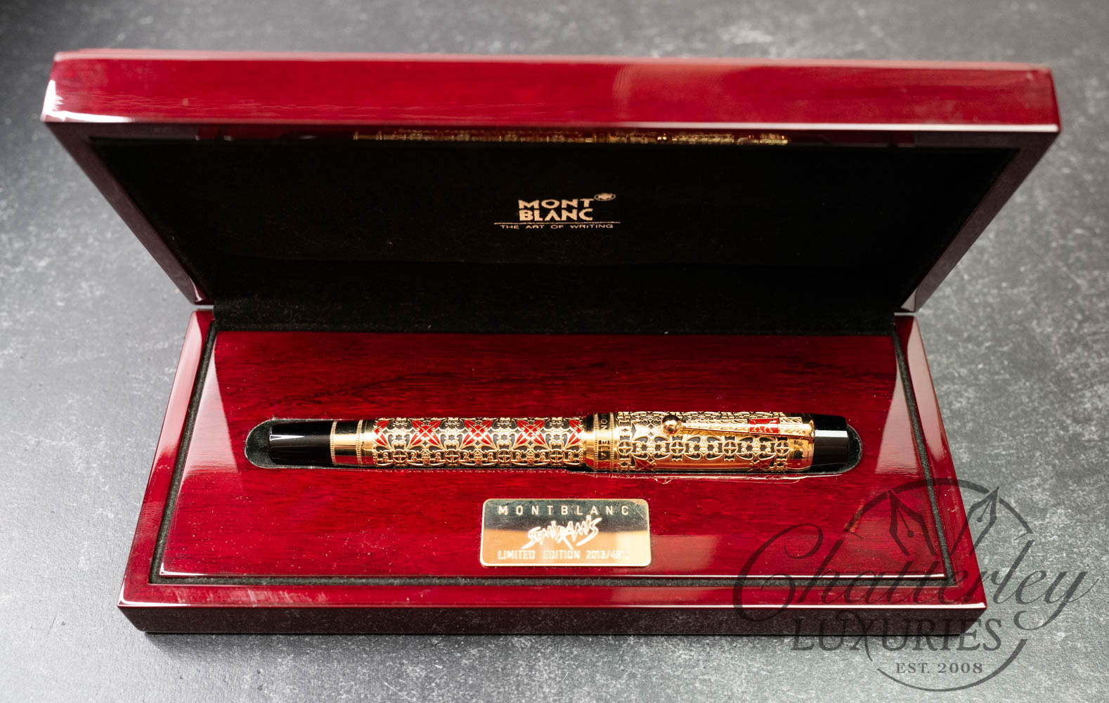 Montblanc Semiramis Patron of Art Limited Edition Fountain Pen – Dedicated to the Queen Assyria. Limited edition of 4810 fountain pens. 1996 Patron of Art series. Delicate gold-plated fret work over black resin cap and barrel. Inlays of red enamel lacquer.