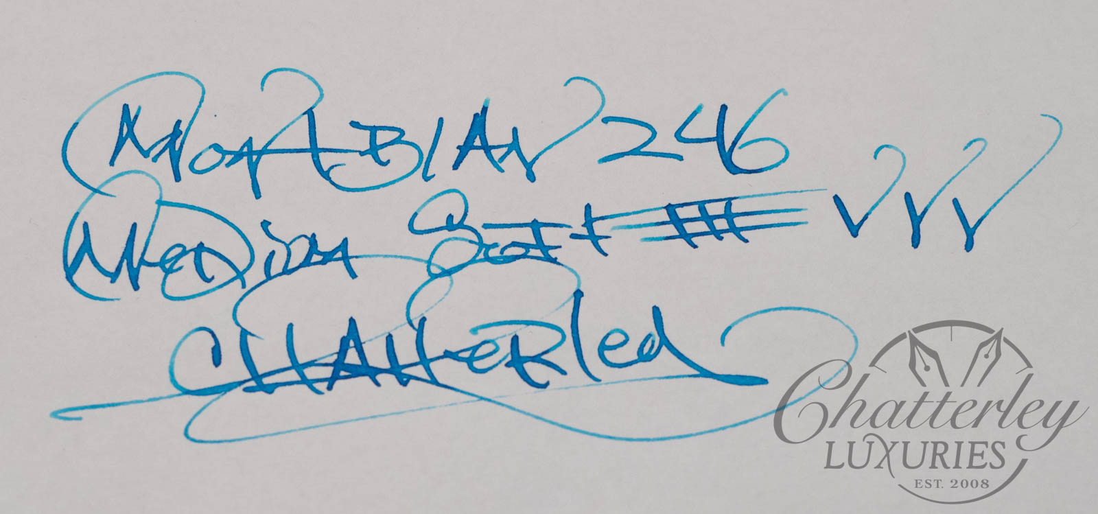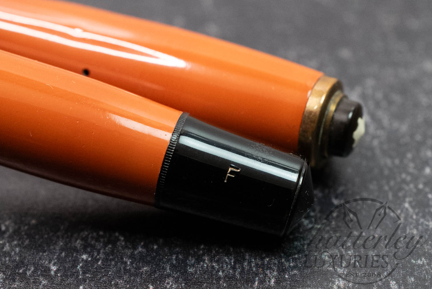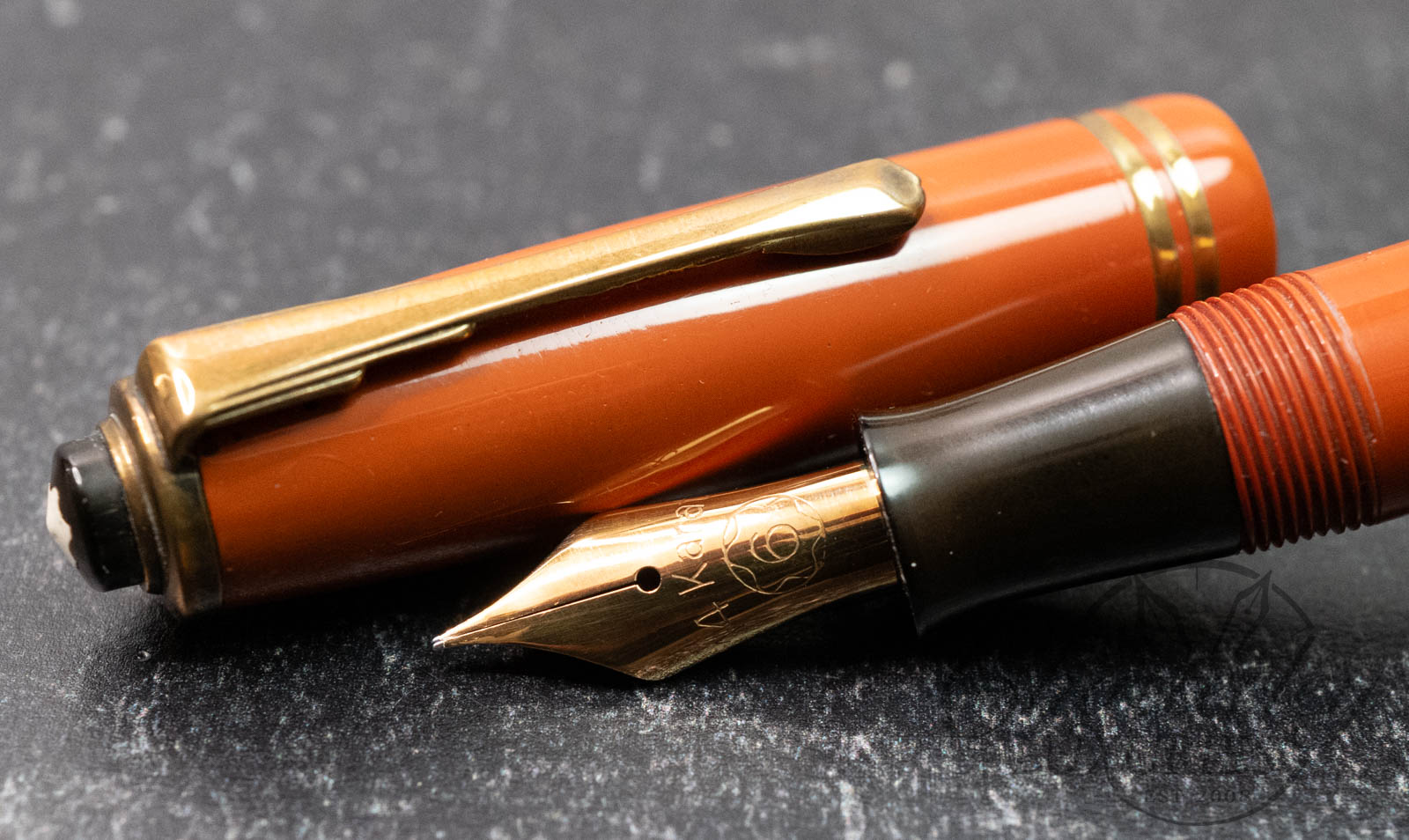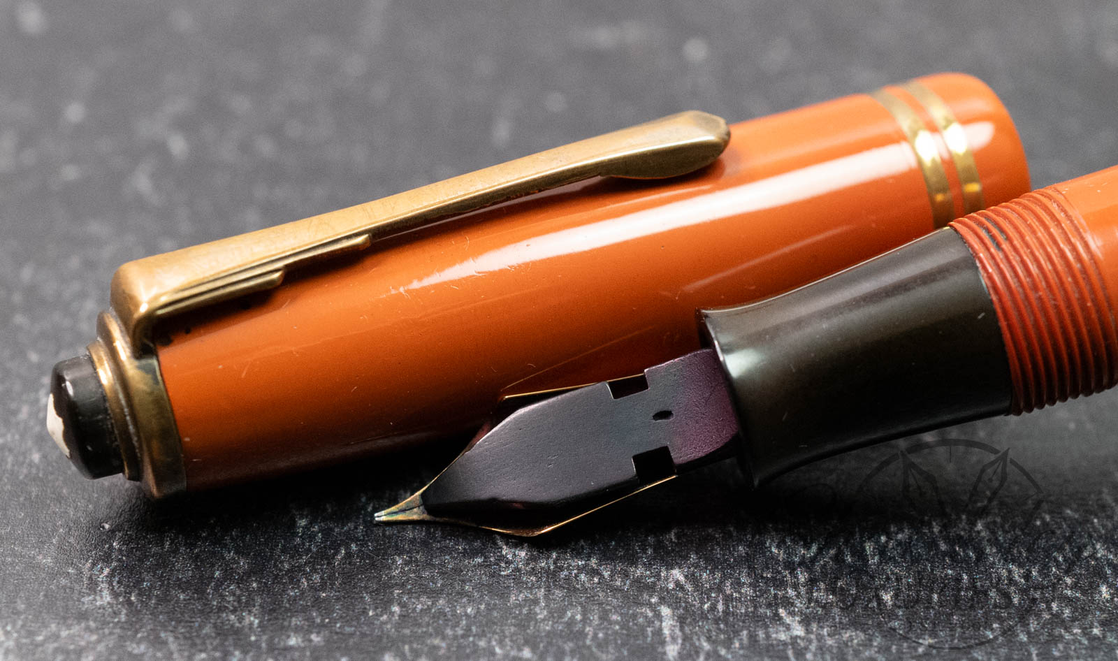 This is a vintage fountain pen that has seen regular use and shows signs of having been lovingly owned through the years. It is equipped with a 14k Medium Soft nib (Marked as a Fine Nib on piston) and fills via a Push Button Filler. (Writing Sample at the bottom)