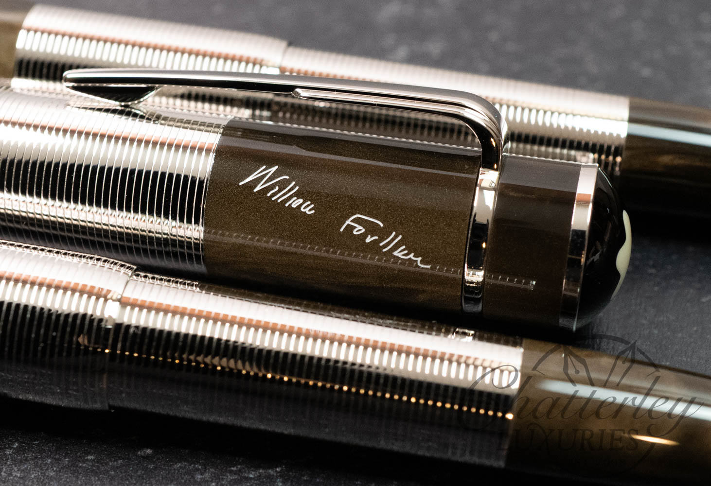 The Writers Edition “William Faulkner” is dedicated to the literary master of modernism. The shape and surface of this unique writing instrument are reminiscent of the novelist’s early creative period and the style of art déco. The black-brown precious resin, shimmering like mother-of-pearl, meets the bright brilliance of the platinum finish with its subtle ring structure. This represents a shift in point of view as we encounter it in Faulkner’s works.