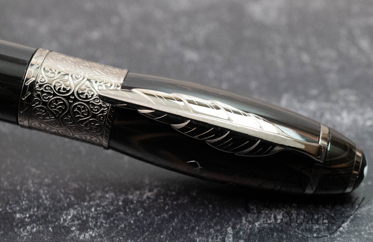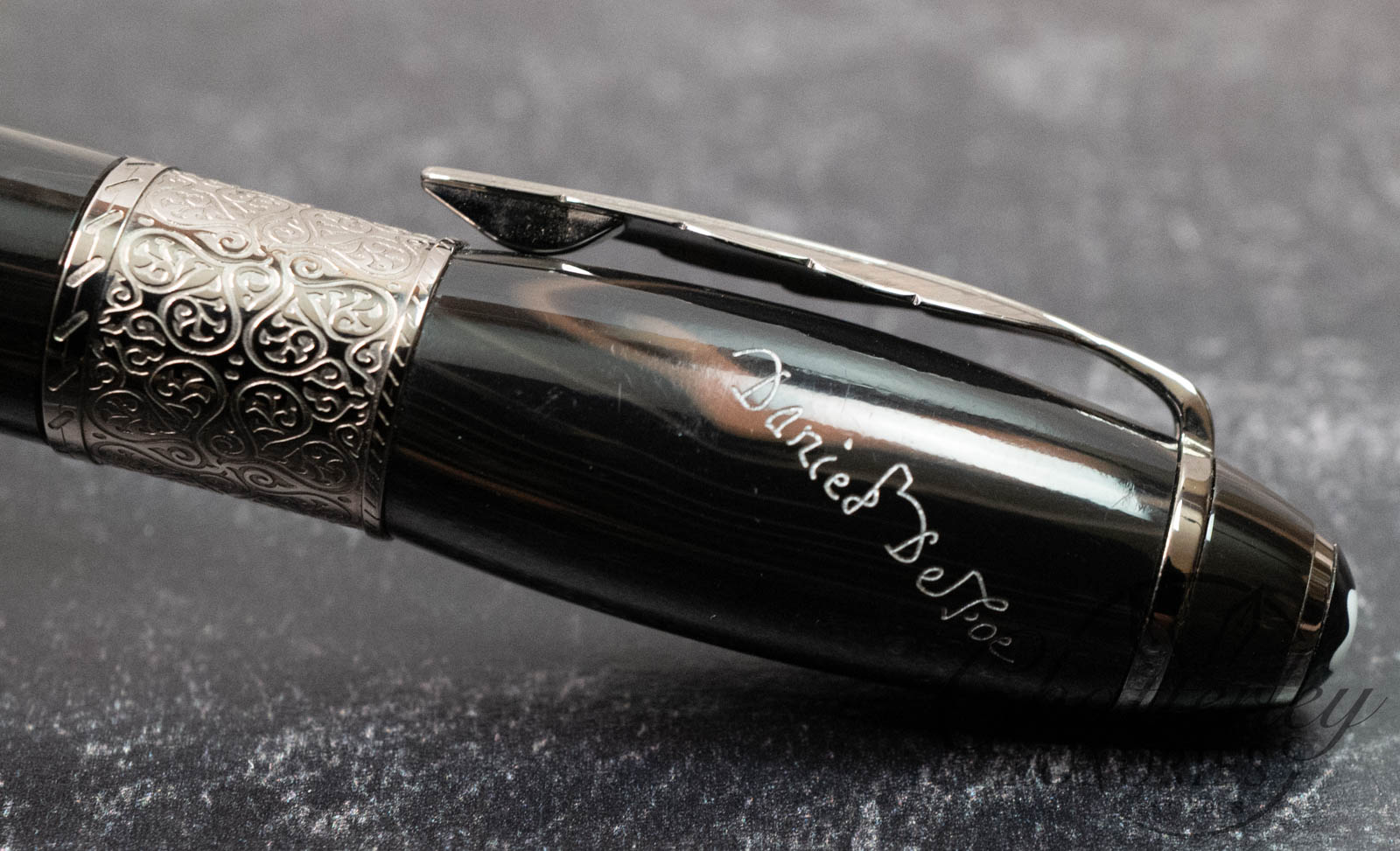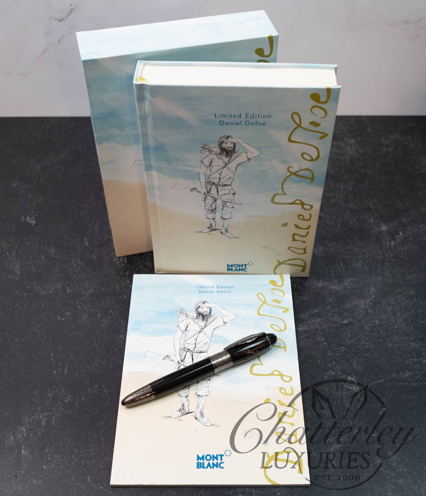 Montblanc Daniel Defoe Writers Edition Pays homage to Daniel Defoe, an English writer, pamphleteer, and journalist best known for writing “Robinson Crusoe” (1719), the story of a man shipwrecked on an island. Defoe is considered one of the fathers of the English novel. “Robinson Crusoe” marked the beginning of realistic fiction as a literary genre.