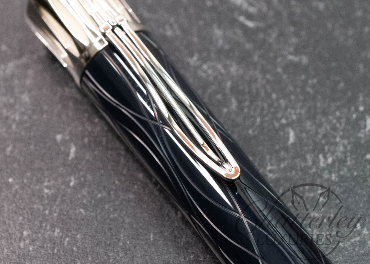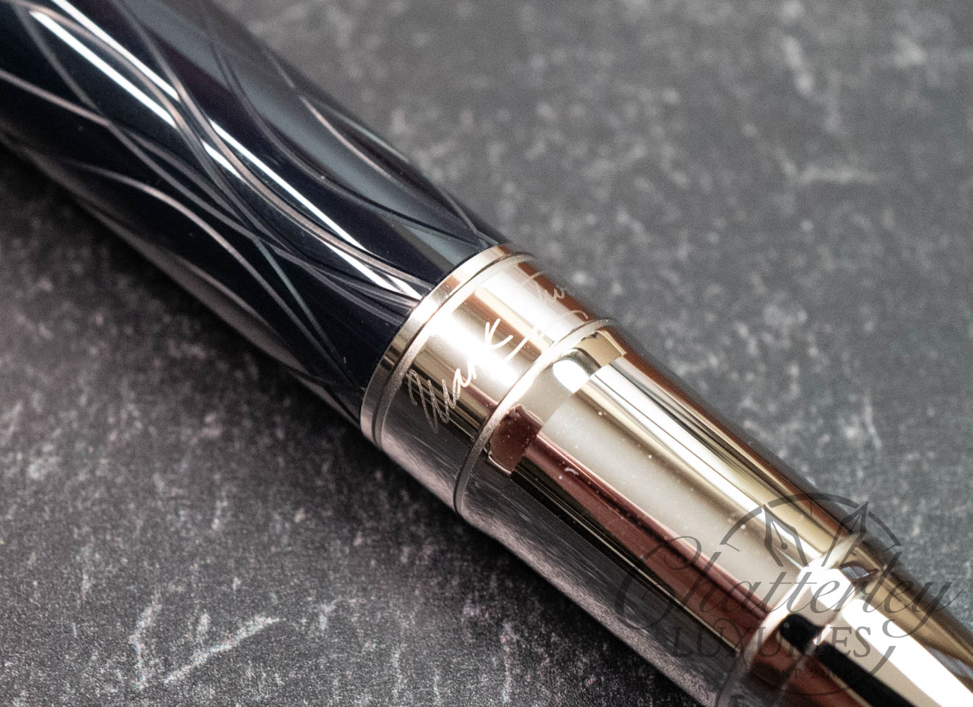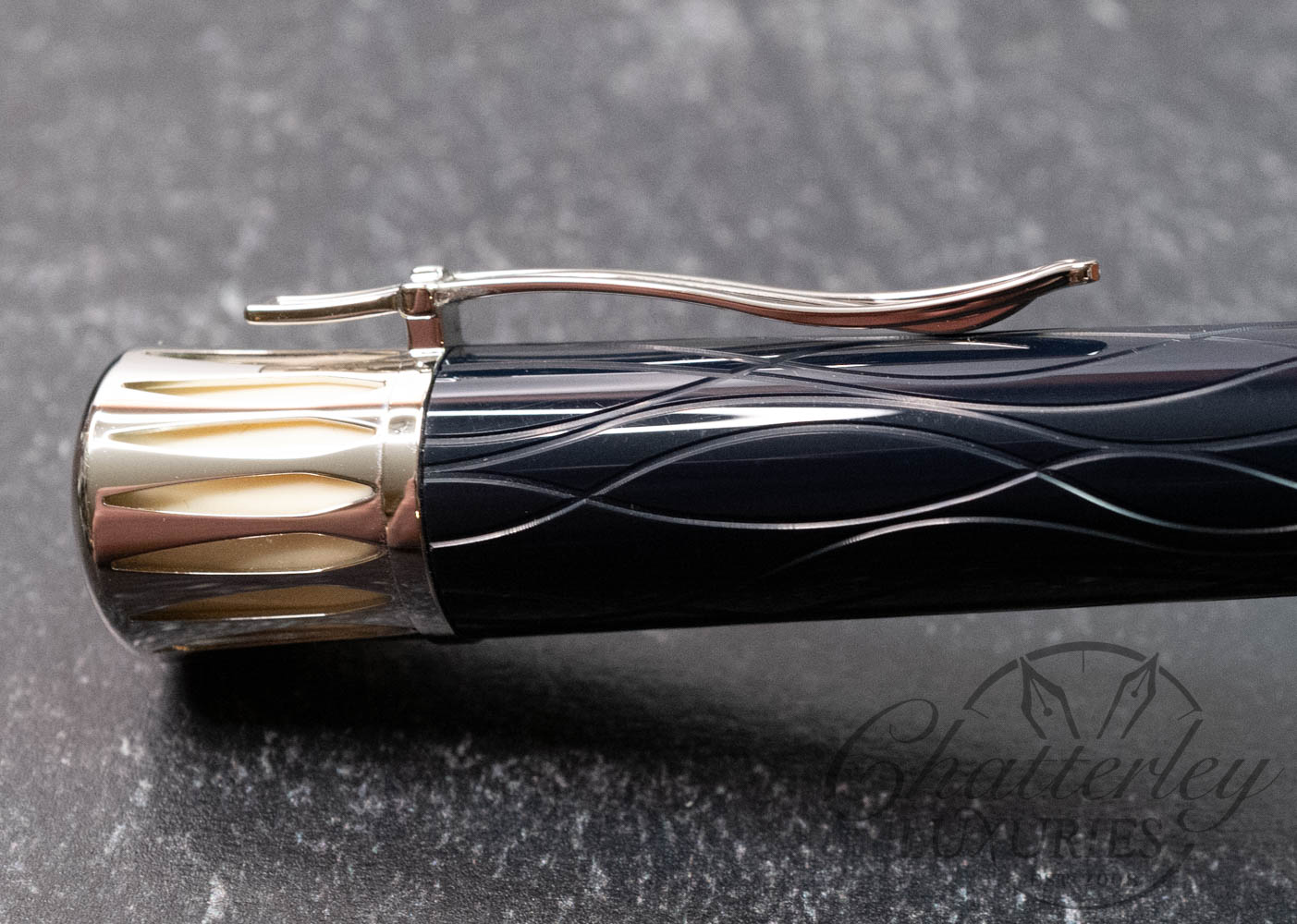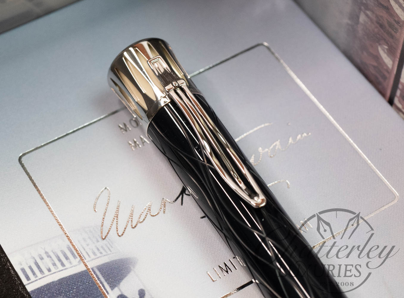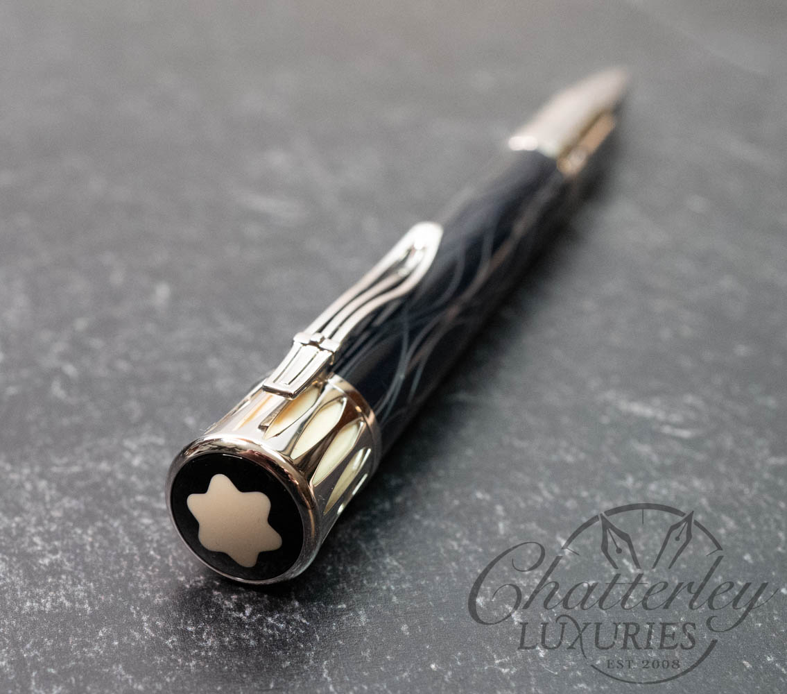 Montblanc marks the centenary of Mark Twain’s death, the great American writer who was inspired by the mighty Mississippi River. The deep-blue precious resin reflects the shallow waves of the river with sinuous curving lines. The top of the cap is shaped to resemble the Mississippi steamboat chimneys, whose steam is illustrated by ivory-colored precious resin. The clip is formed by a stylized harp, a musical instrument that was popular in the Southern states in Twain’s time. The crowning features of this unique Limited Edition are Mark Twain’s signature and the number of the pen on the  cap ring.