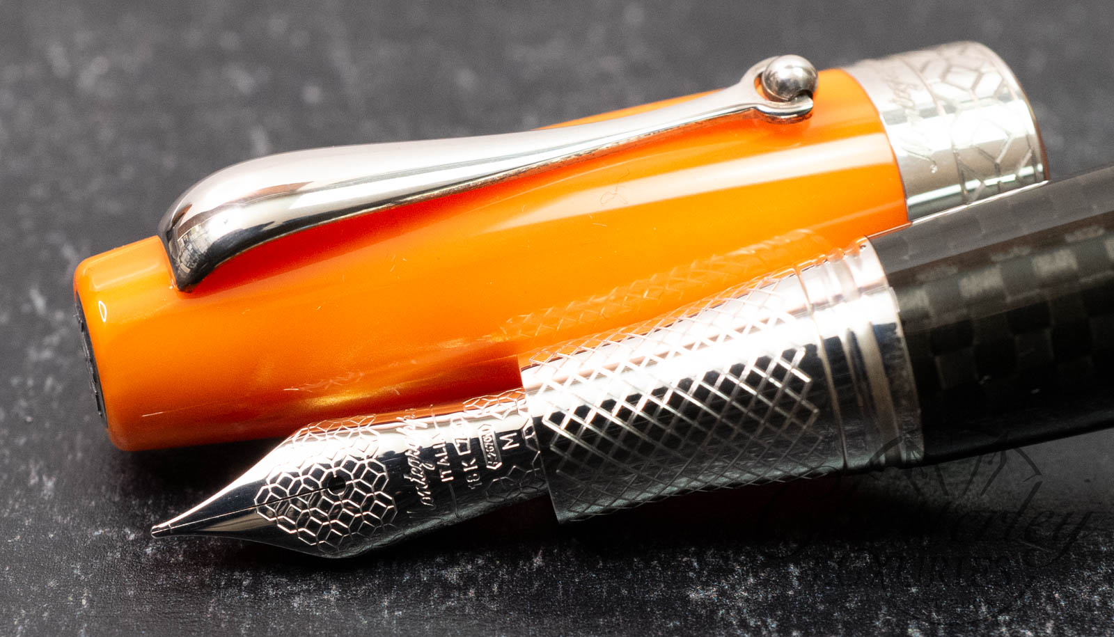 Miya Carbon is available as a rollerball, twist-action ballpoint or fountain pen with 18k gold nib. All Miya Carbon pens feature Montegrappa’s a rolling end piece on the pocket clip, an octagonal motif on the cap’s silver trim, and the company’s new ‘secret’ detail: the back of the pocket clip is finished in red lacquer.