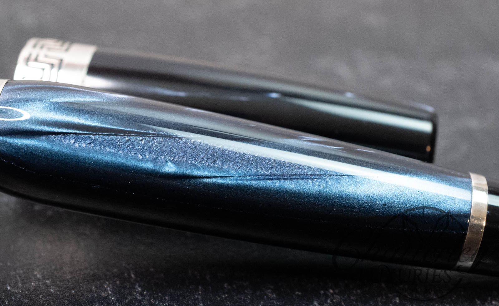 Miya is fashioned in precious celluloid with finishing parts in sterling silver: the characteristic rotating sphere, the new Greek key pattern fret-worked on the cap band and the convex disc on the end of the barrel are the decorative elements which emphasize the bold modernity of the pen’s rounded lines.