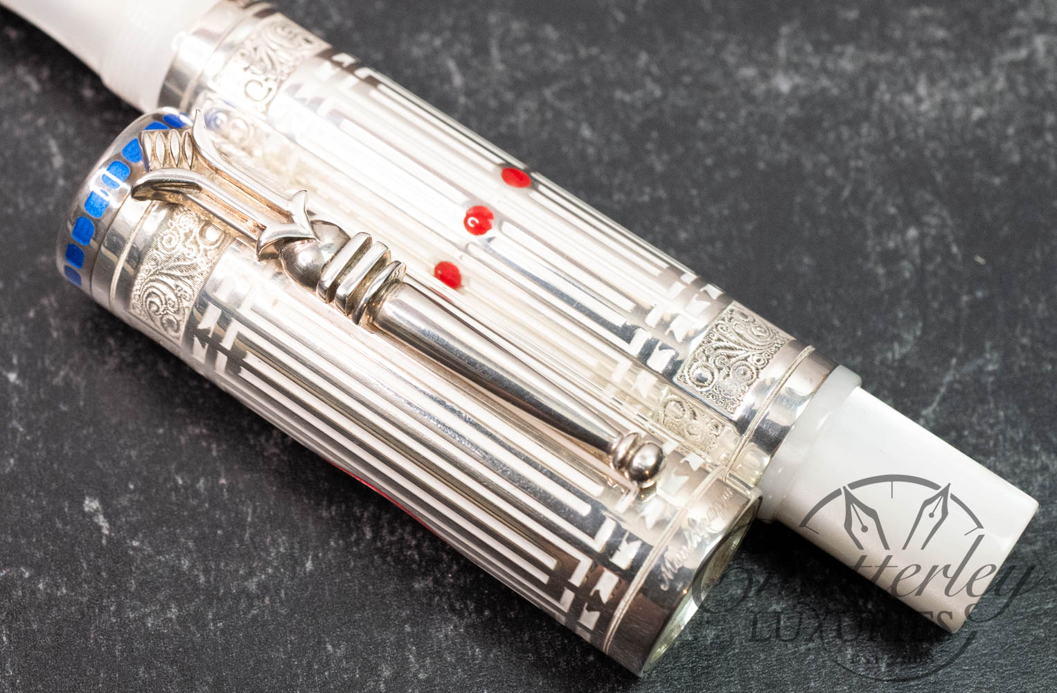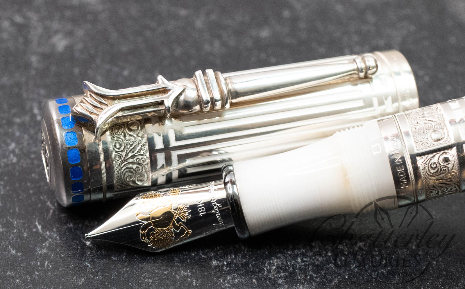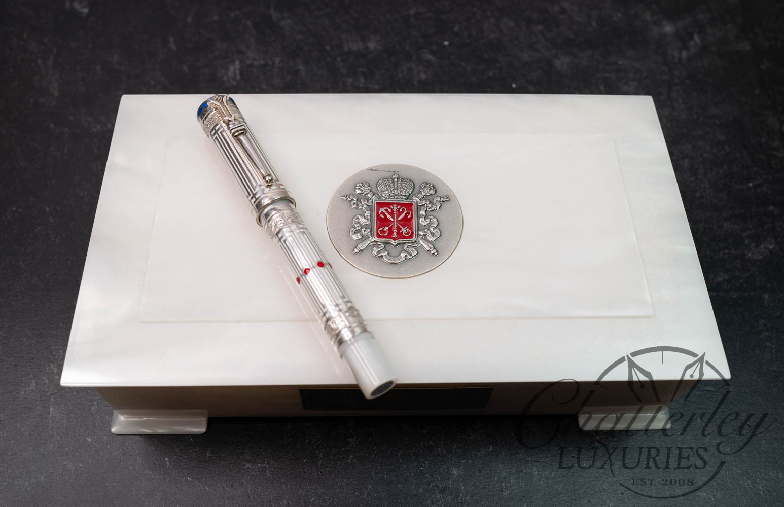 Montegrappa dedicates this limited edition to the third centenary of St. Petersburg’s foundation (1703) and its name recalls the particular phenomenon that has made this fascinating city famous throughout the world: the white nights. Montegrappa has reproduced on the body of this fine writing jewel some peculiarities of St. Petersburg with the low-relief engraving technique and hand application of precious enamels: the details of the ironwork fence of the Summer Garden and of the Mikhailovski Garden decorate the body, the city’s coat of arms is reproduced on the cap.
