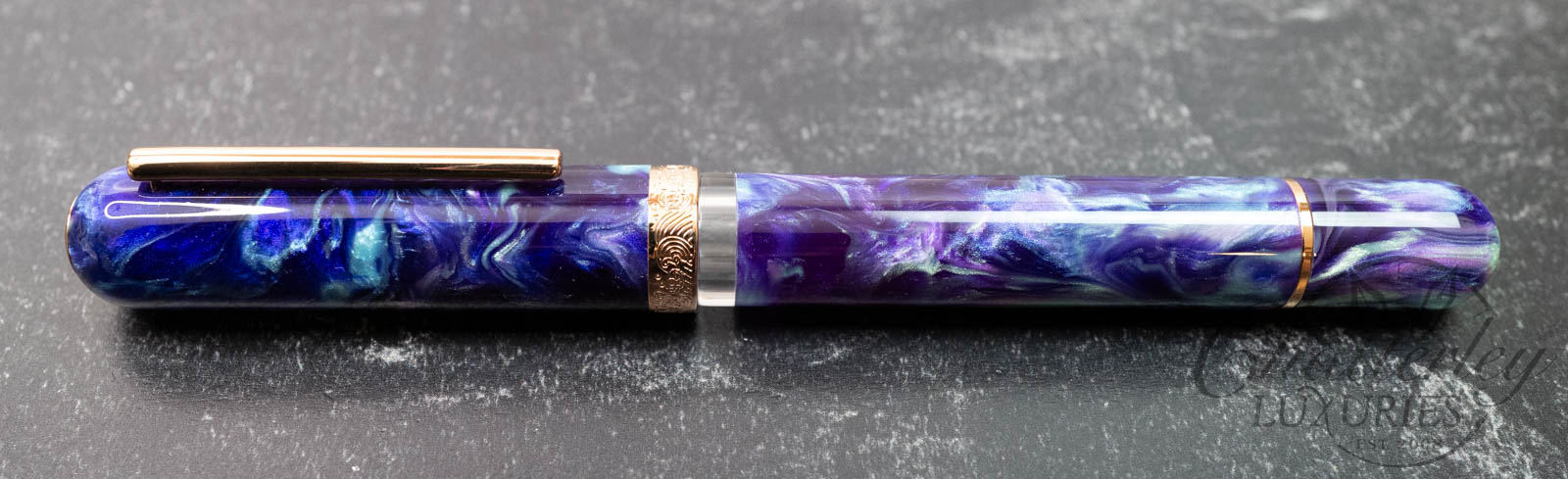 This pen is pre-owned and in near-perfect condition, it does not appear to have been inked. It comes complete with a box and papers and is equipped with a Steel Rose Gold-plated Medium nib. It fills via a Piston Filling System. The pen is made using “Aurora Polaris” resin from Corl Creations by Bob Dupras.