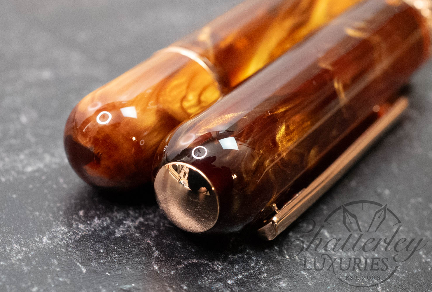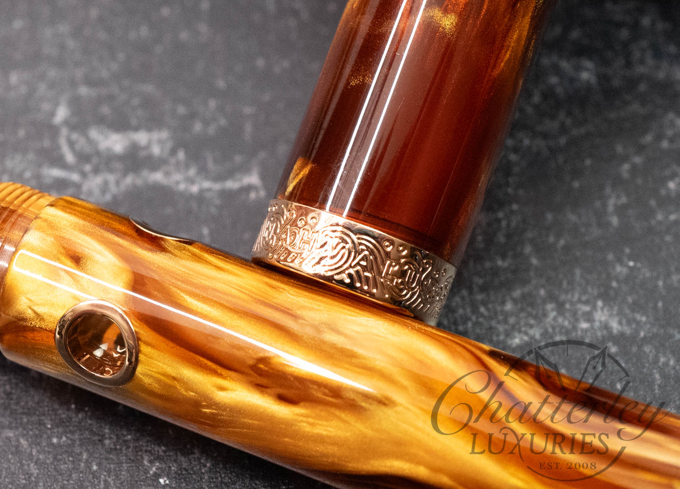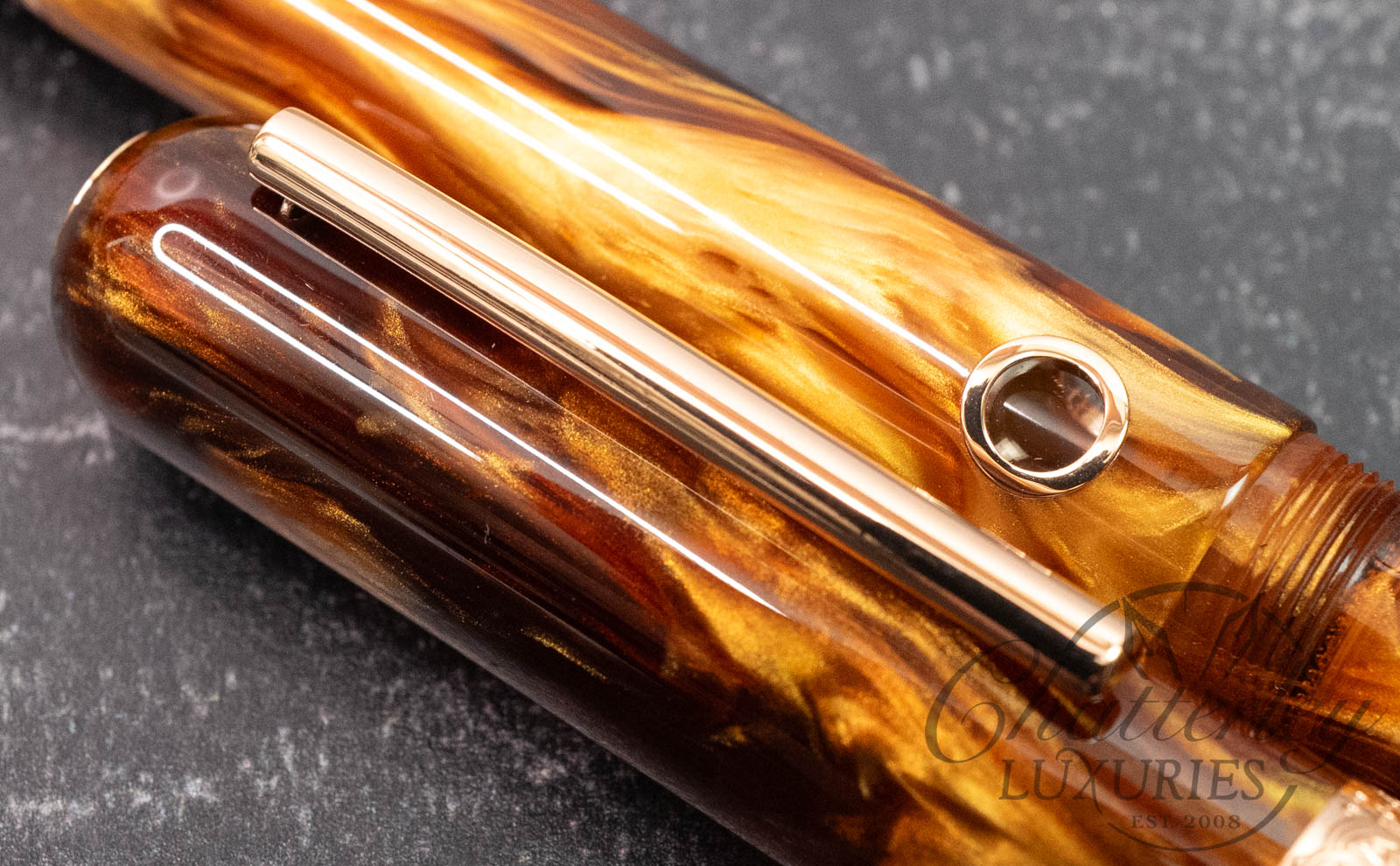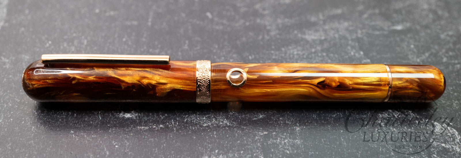 This pen is pre-owned and in near-perfect condition, it does not appear to have been inked. It comes complete with a box and papers and is equipped with a Steel Rose Gold-plated Medium nib. It fills via a Piston Filling System. The pen is made using “Sunset Ember” resin from Corl Creations by Bob Dupras.