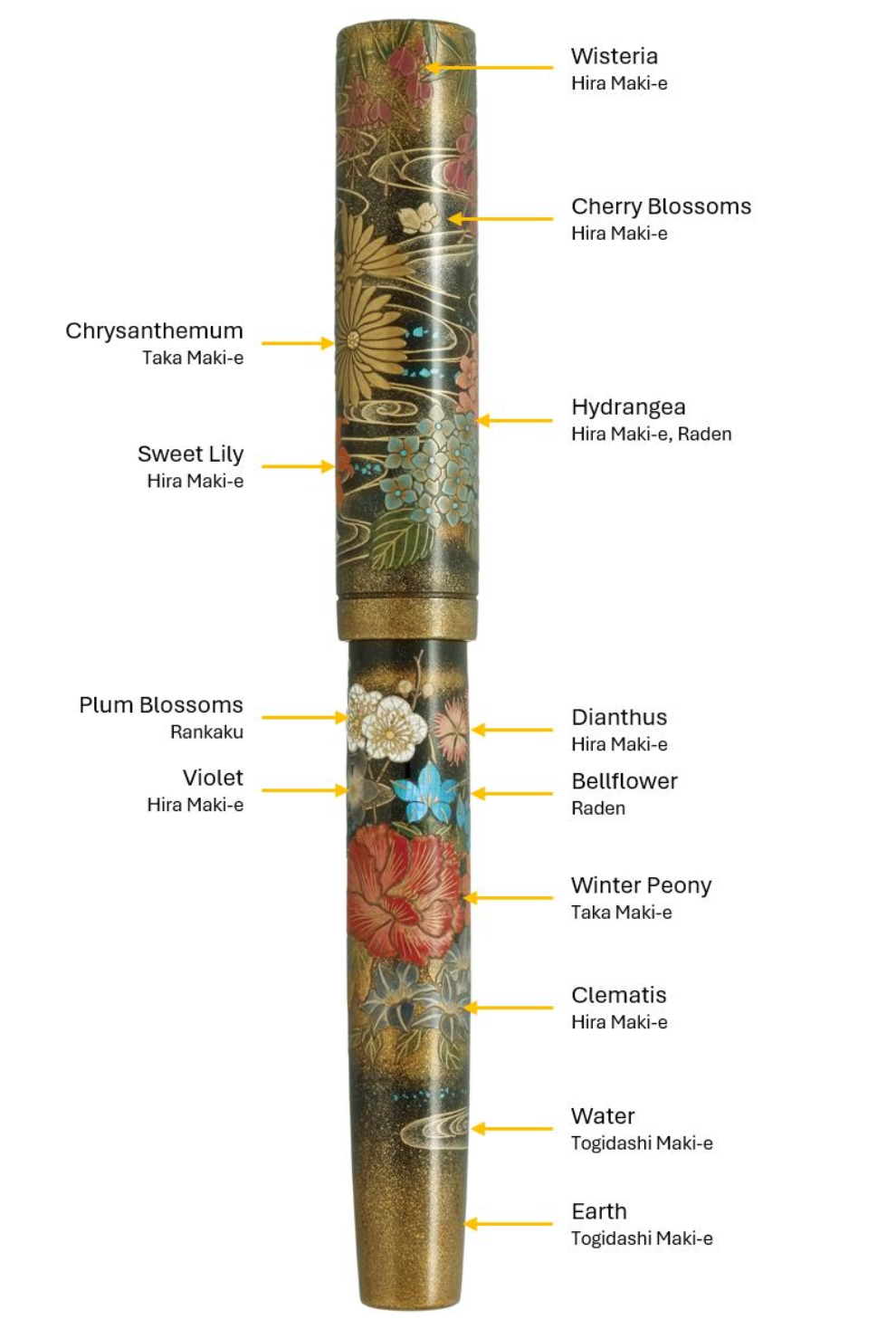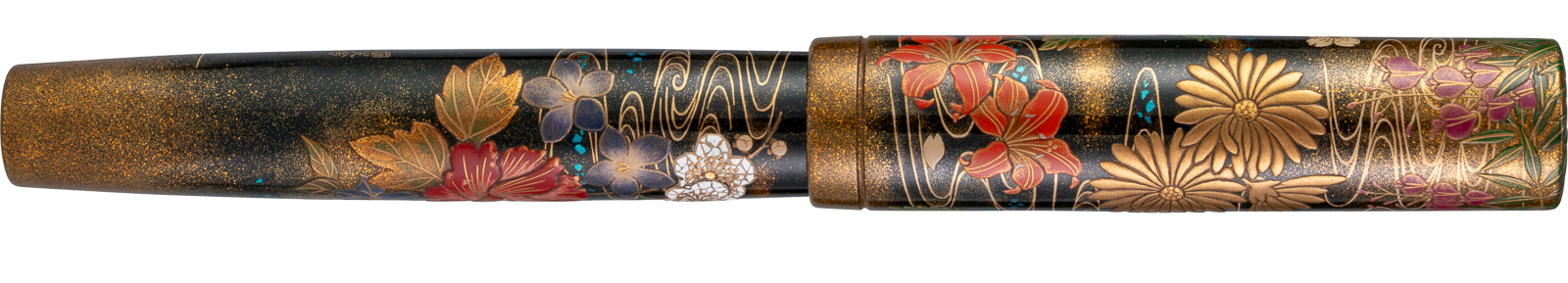 Maki-e—the centuries-old Japanese art of painting with lacquer sprinkled with gold or silver powder—is at the heart of this pen. Techniques include: