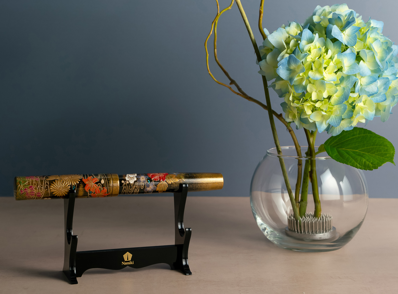 Crafted by KOKKOKAI artisan Yutaka Sato. Each pen requires an extraordinary amount of time: every flower is applied in layers of lacquer, gold, raden, and eggshell, painstakingly polished between applications.