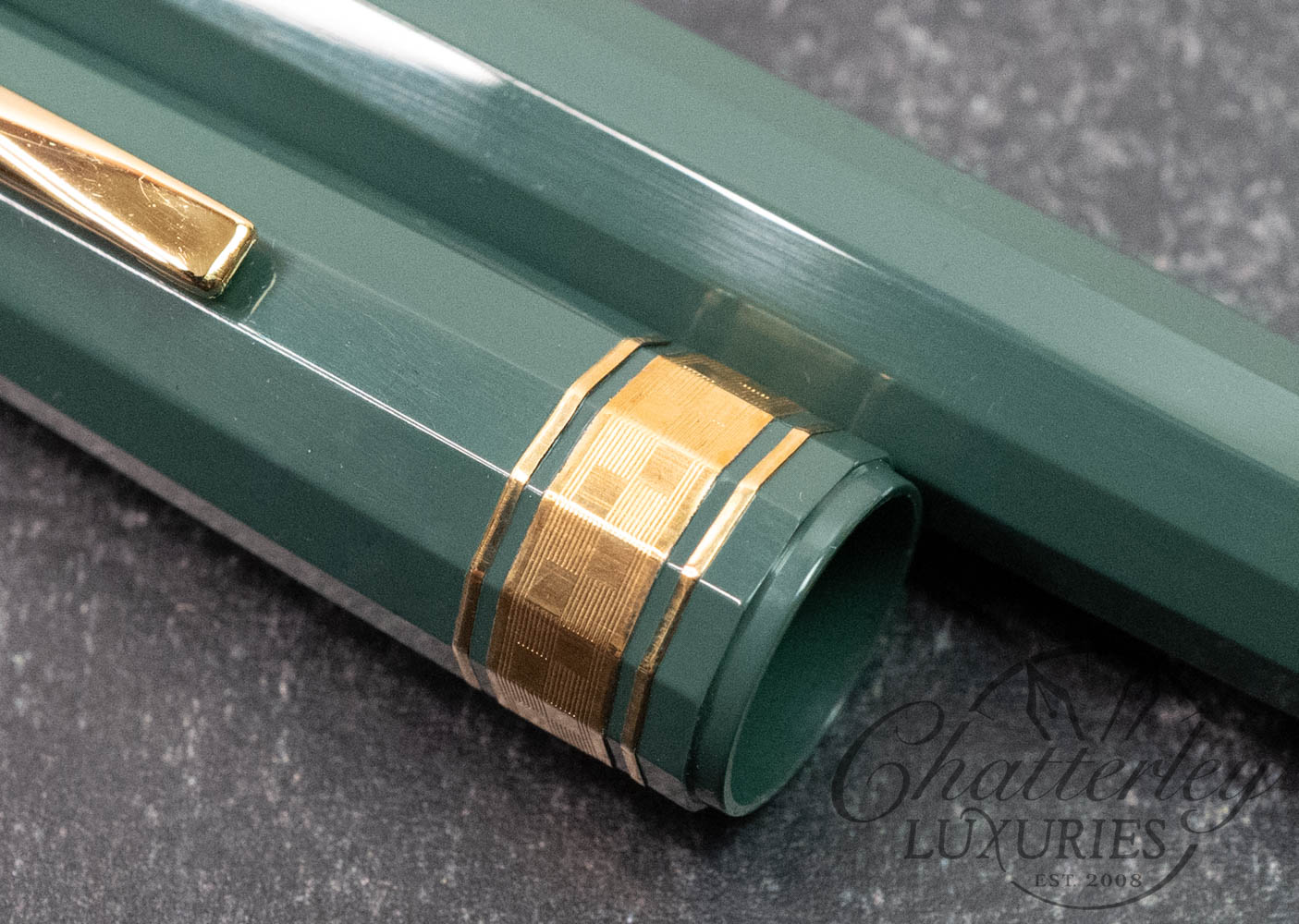 This pen is lovingly used and comes complete with the box and papers. It is equipped with an 18k Fine nib and fills via a Piston Filling System. The nib is not the original ’90 Commemorative nib that came with the pen, but instead has the nib from the Omas Ferrari 348 Challenge Fountain Pen (the Ferrari horse icon).