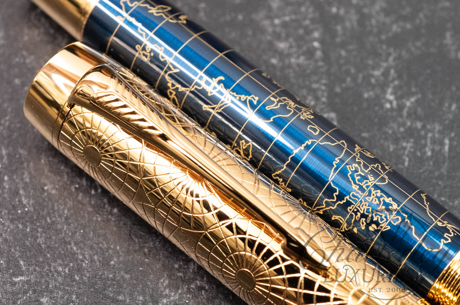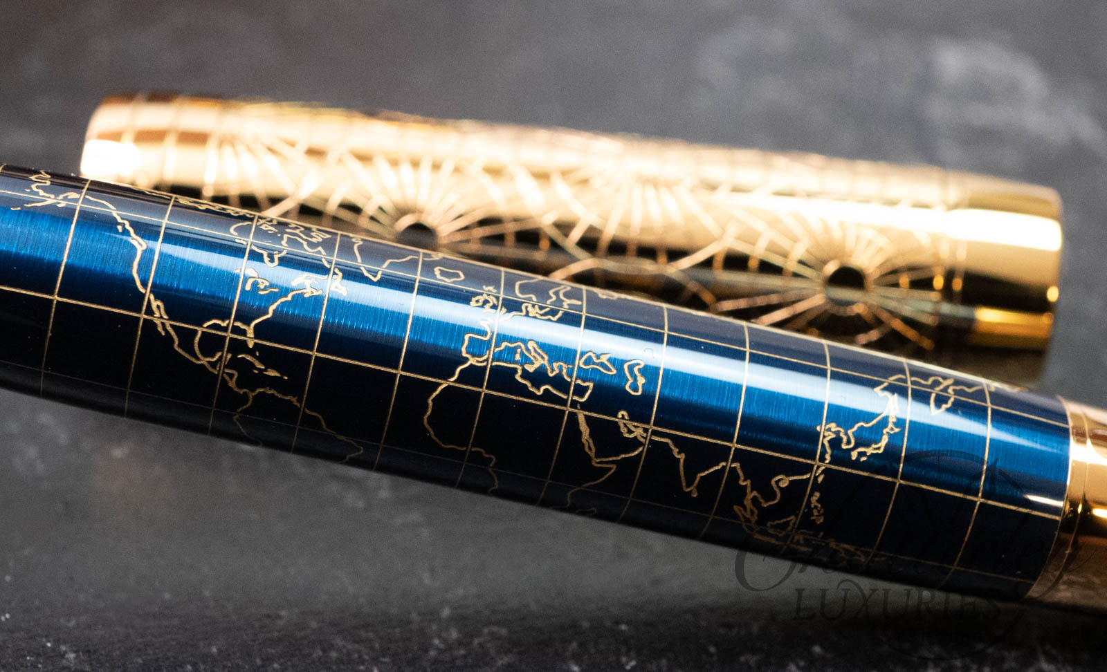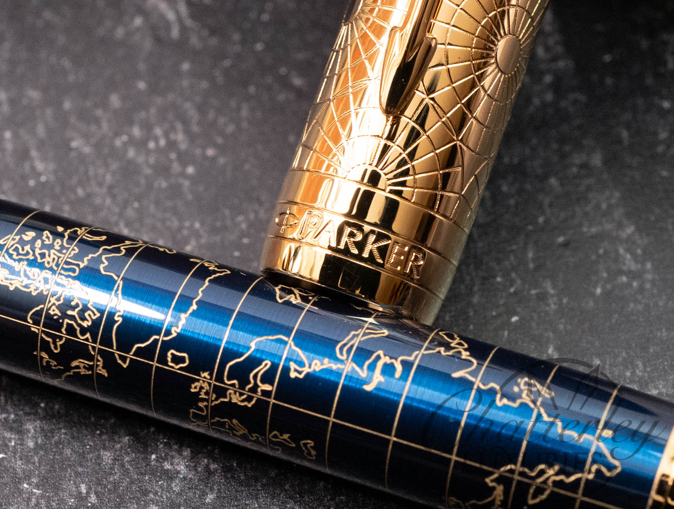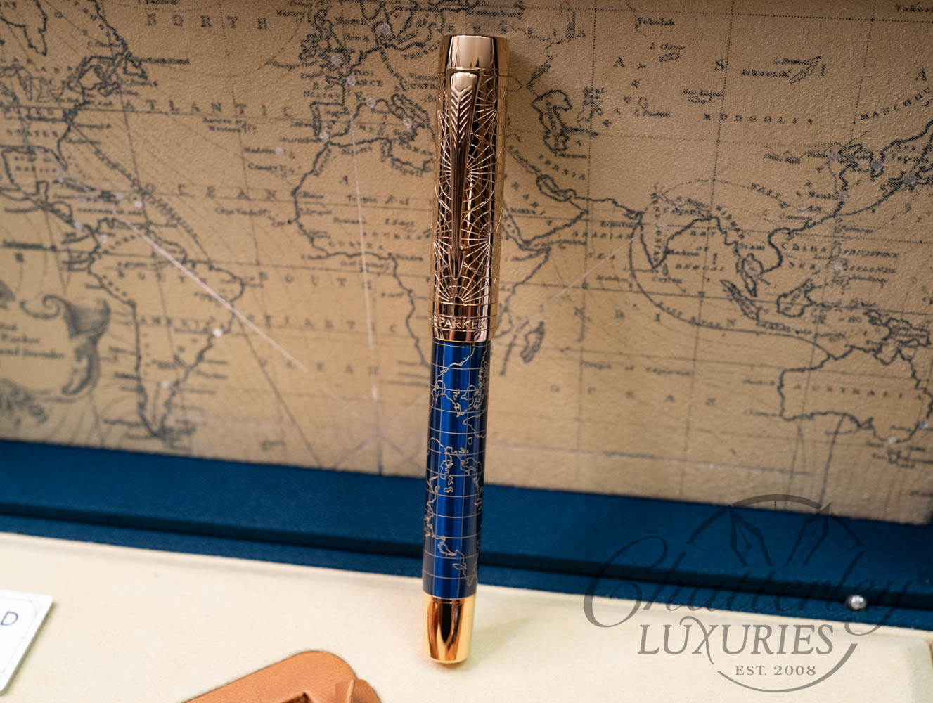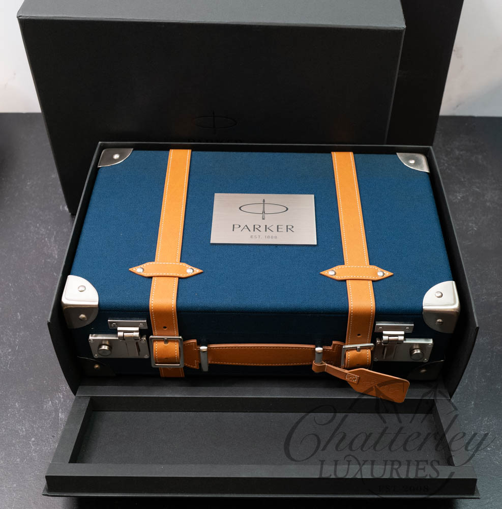 The 2018 Duofold Limited Edition will include only 1,300 fountain pens, a testament to Parker’s 130th anniversary (founded in 1888). The Duofold’s 22 components are manually assembled in Nantes, France: the solid brass body laser-engraved with golden map lines; the barrel covered in a deep blue lacquer; and the 2ct lapis lazuli jewel set into the cap crown. The bi-color 18K gold nib is engraved with a compass alluding to the science of navigation and the steamships George used to travel the world. The luxurious gift box is styled to resemble vintage luggage in blue linen with latches and a metal Parker logo plate on the top. A luggage tag is embossed with George’s initials. The Craft of Traveling presentation also includes a limited edition bottle of ink and ink cartridges. The Certificate of Authenticity is signed by Geoffrey Parker, great grandson of George S. Parker, founder of the brand.