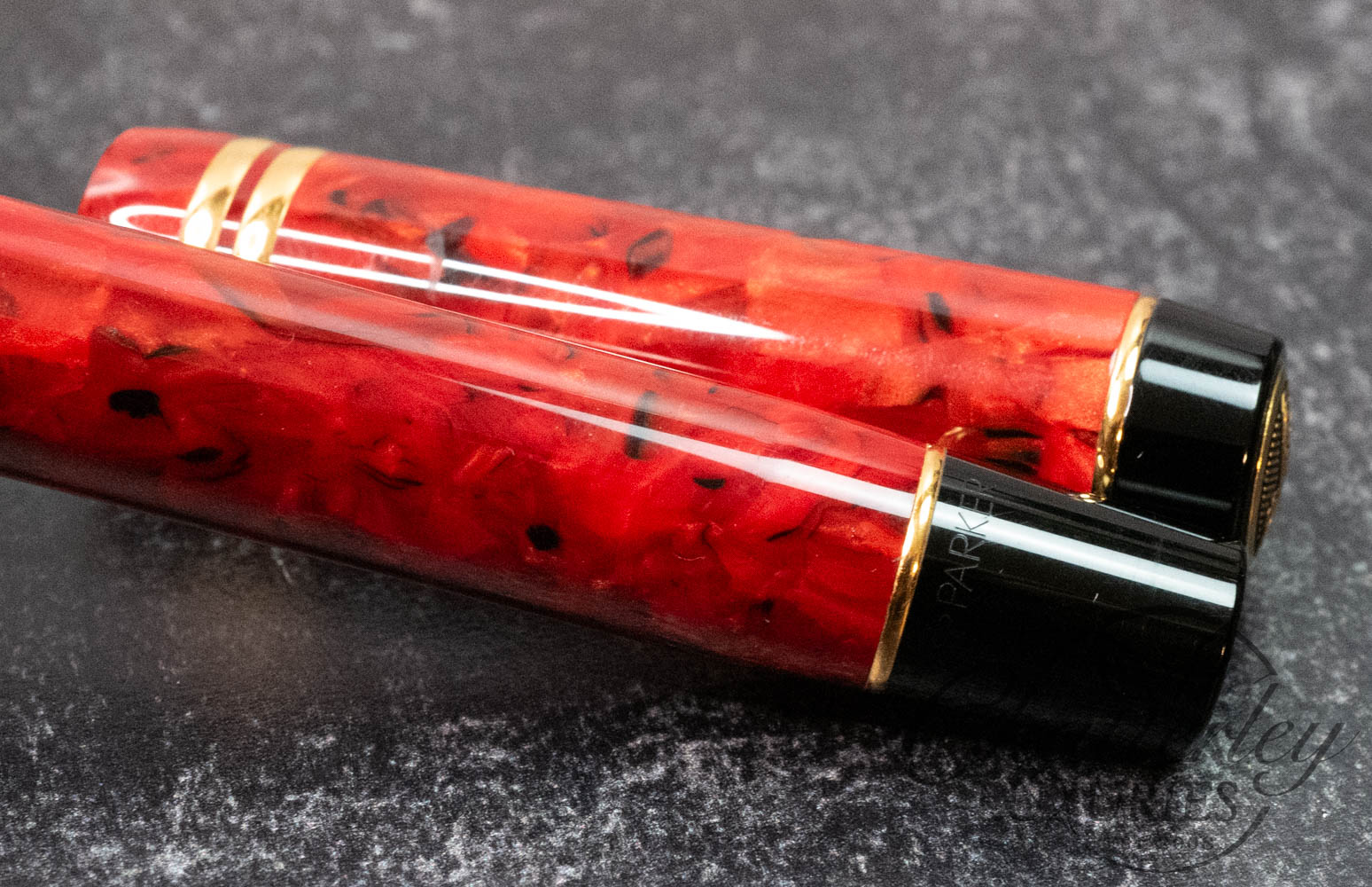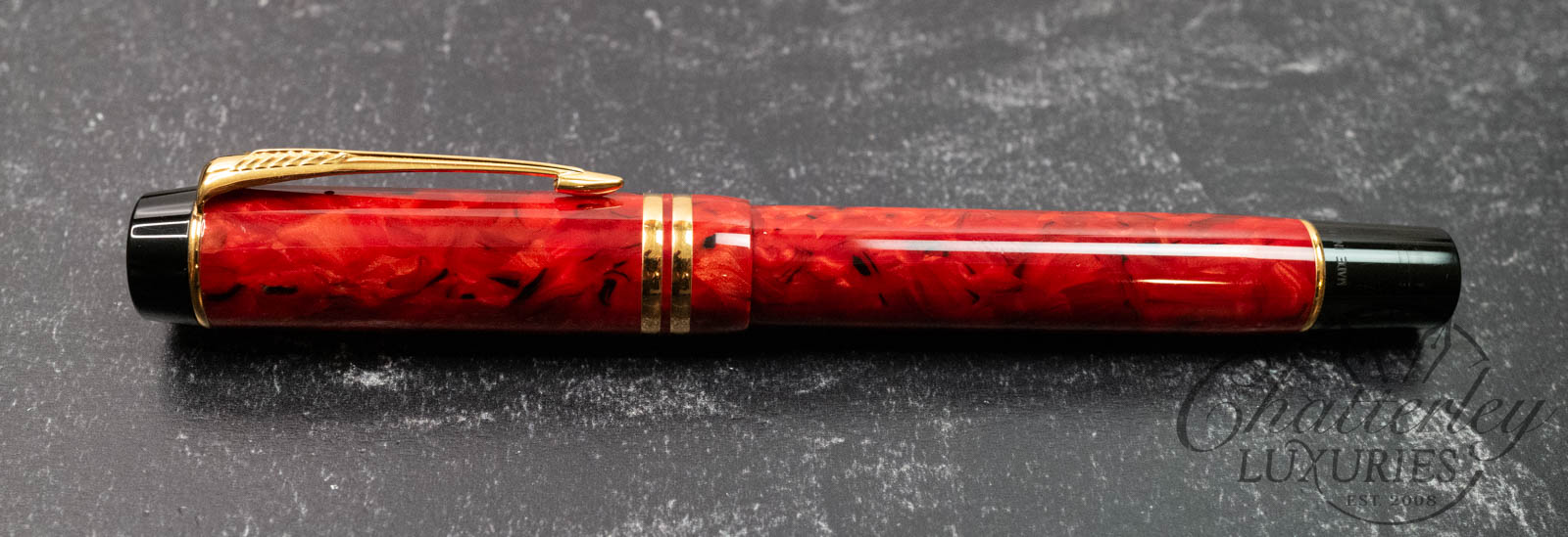 The barrel of the Duofold International is made of a marbled red resin.