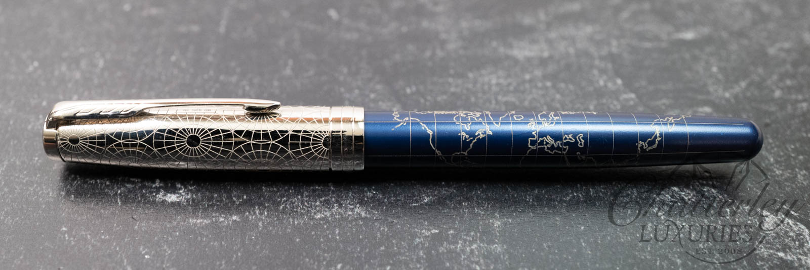 Inspired by the concept of a limitless world at our fingertips, the Sonnet Special Edition “Atlas” embarks on an endless journey. The pen features an intricately etched sterling silver cap and a precise map design on its blue case, which together span the seven continents and inspire the setting of new ambitions. This instrument embodies the exceptional quality and definitive craftsmanship that define the Parker legacy.