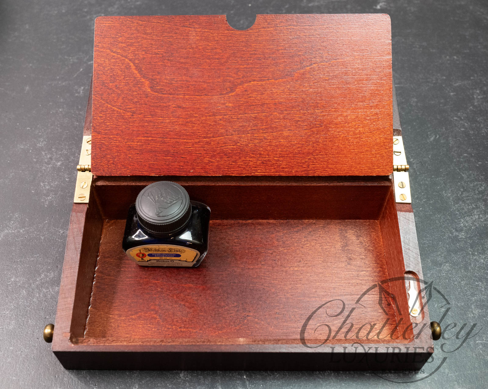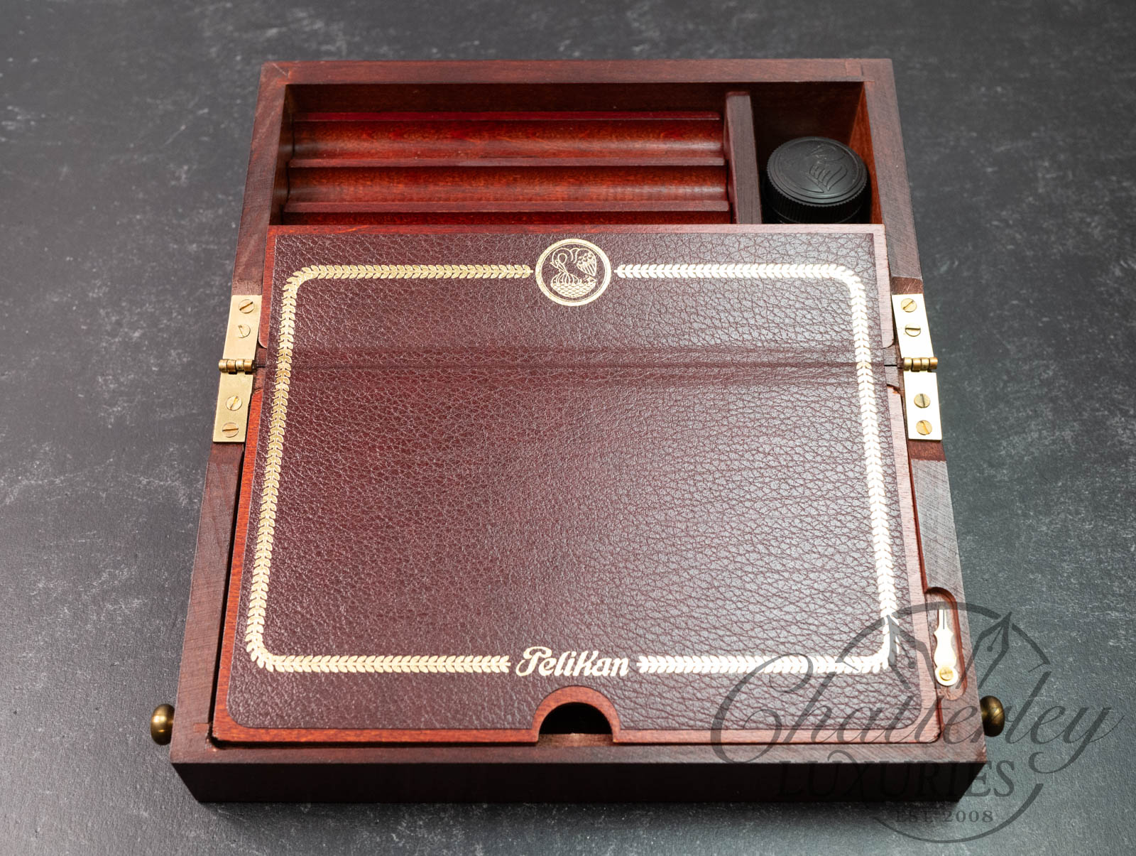 The design is based on the travel writing desks used during the “stagecoach era,” a time when traveling salesmen and artists required a portable base for correspondence. One of Pelikan’s founders, Günther Wagner, reportedly used a similar original during his own travels to write his many business and personal letters.