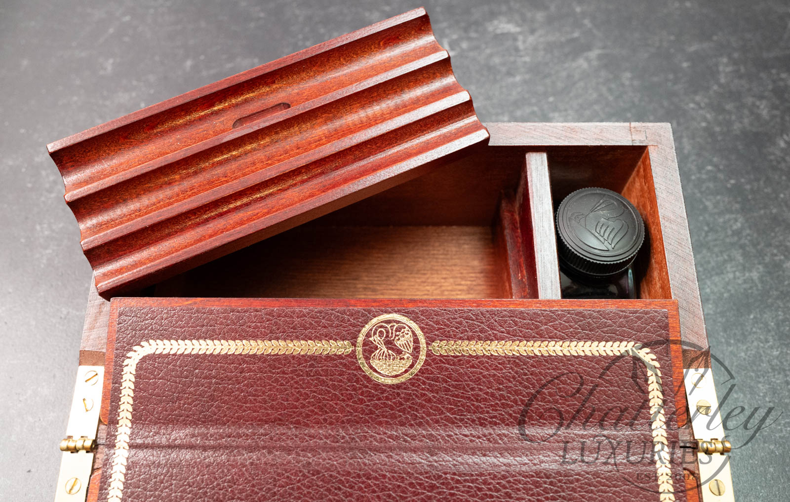 The Pelikan Historical Art Collection Travel Ecritoire de Gunther Wagner is a luxury reproduction of a 19th-century portable writing desk. It was famously used as a presentation set for the Pelikan Toledo M910 Silver Special Edition fountain pen. It acts as both a storage case for luxury writing instruments and a mobile writing base.