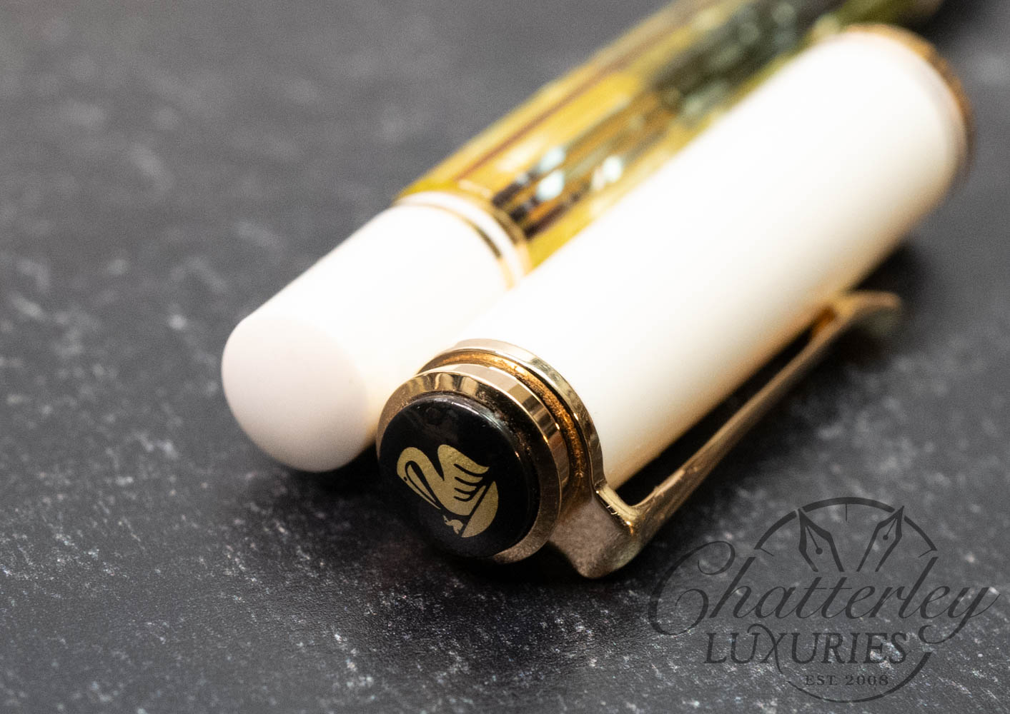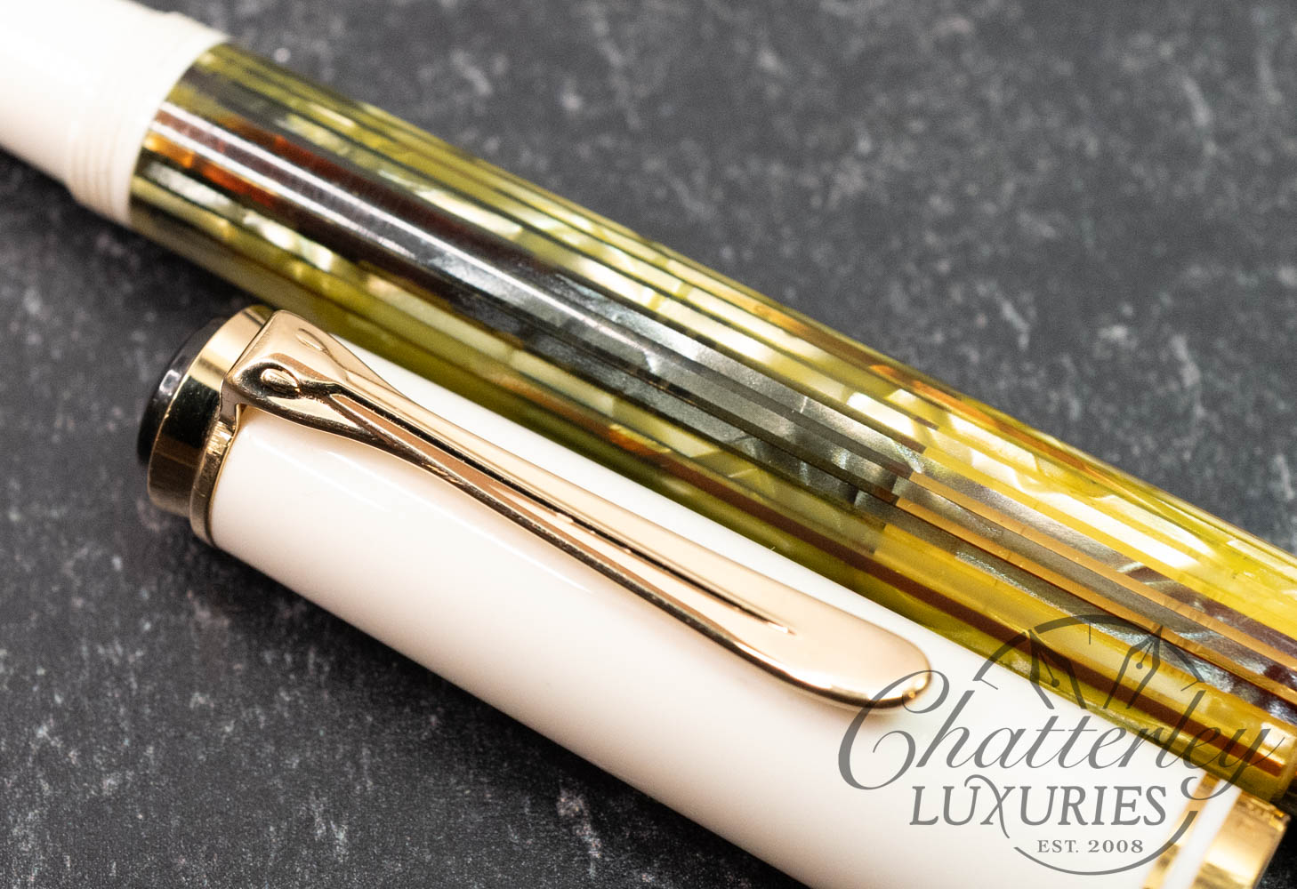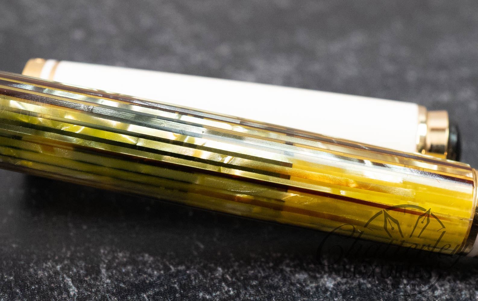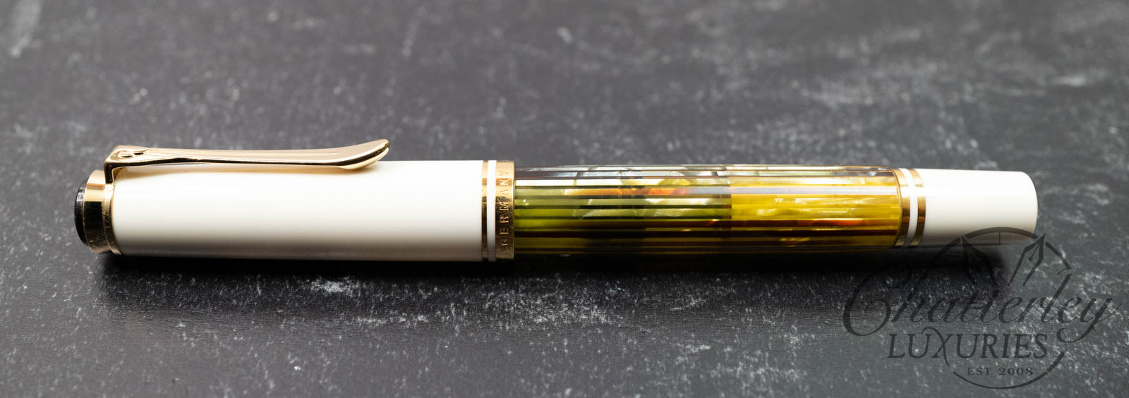 The tortoise-white Souverän pen was produced in 2004, along the lines of the pen model 400 of the 1950’s with a tortoise-brown/transparent ink container. Its striped, transparent sleeve shines delicately in gold. The cap and the remaining parts of the body are held in white and give this model its characteristically bright and friendly splendor.