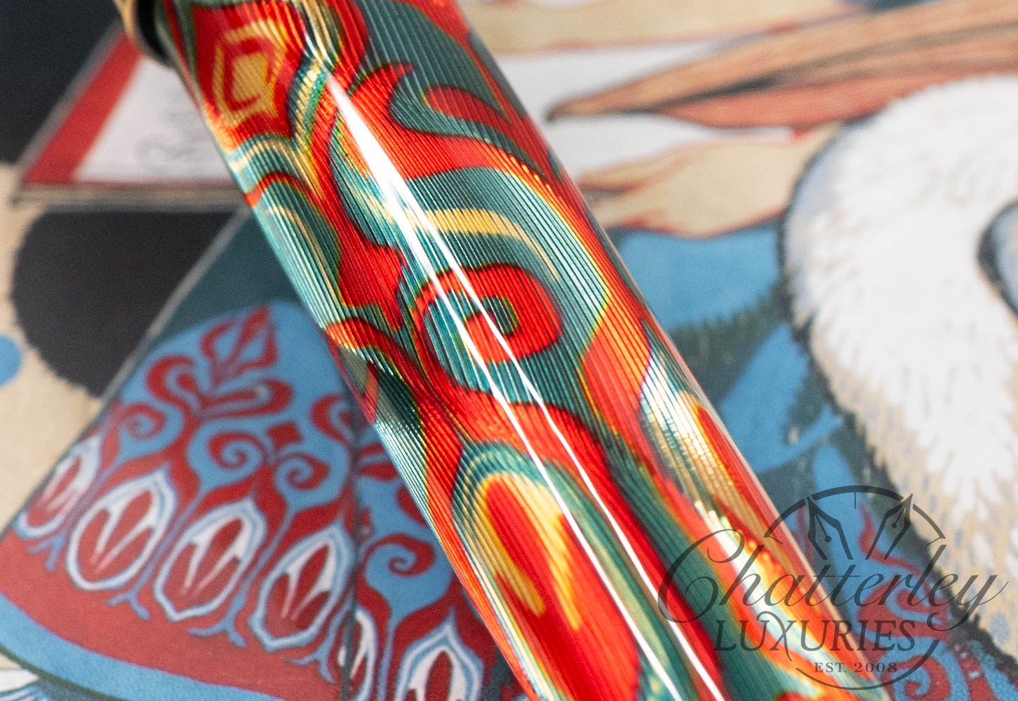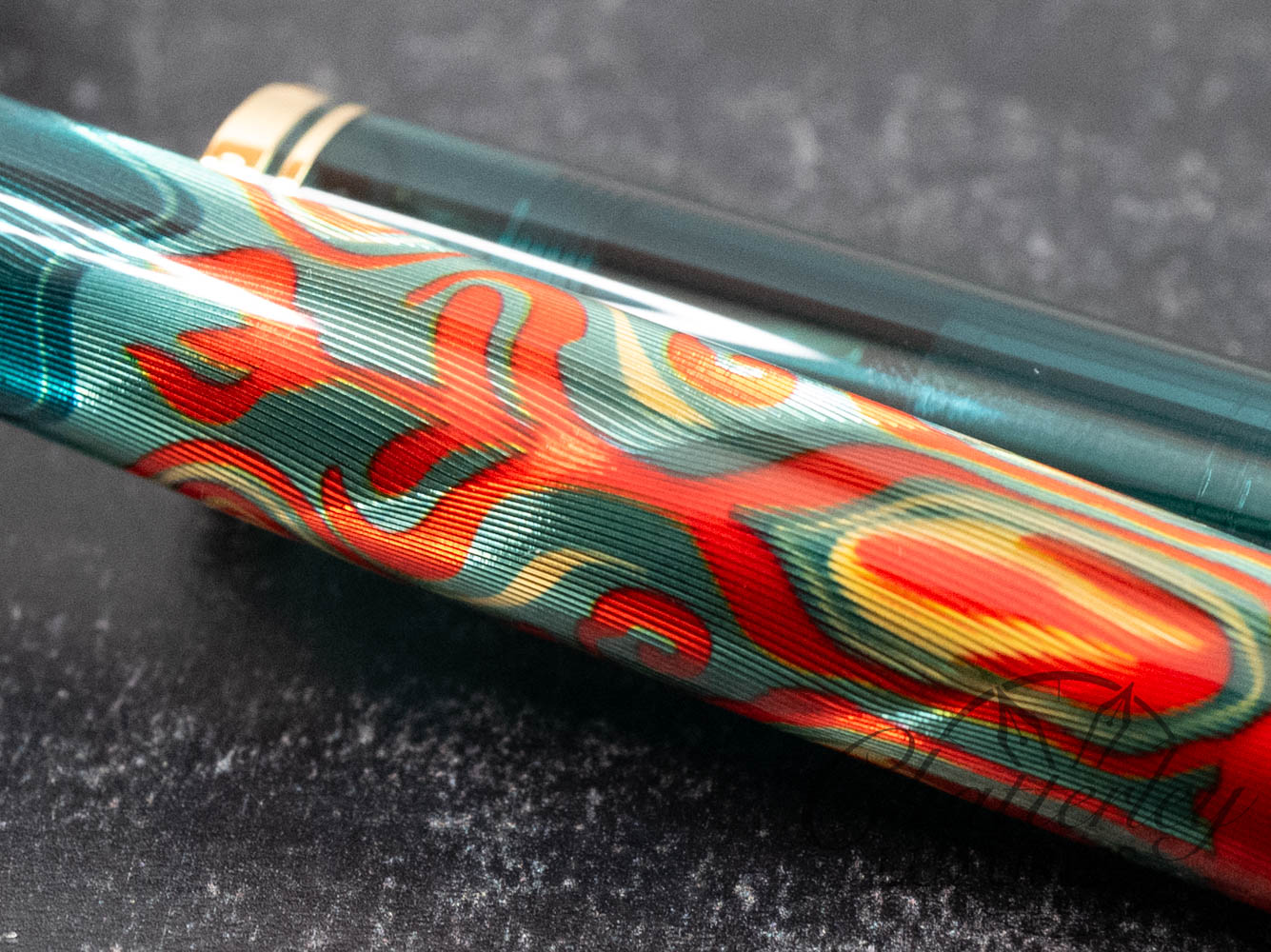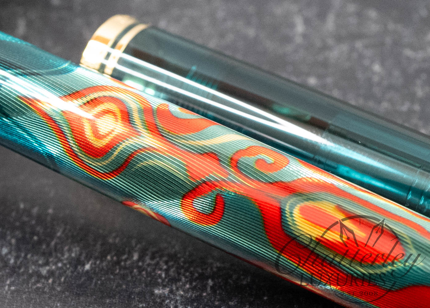 The unique appearance of this pen is the result of a multi-step process. The brass barrel material is first engraved and guilloched, creating fine grooves that ultimately achieve a unique light-reflecting holographic effect. Ten layers of lacquer are then applied, and after polishing, the surface is then printed with the colored image motif. Final polishing then accentuates the colors and brings the surface to a high gloss shine.