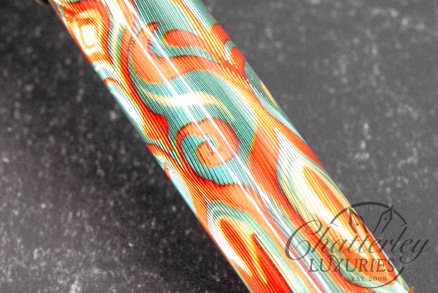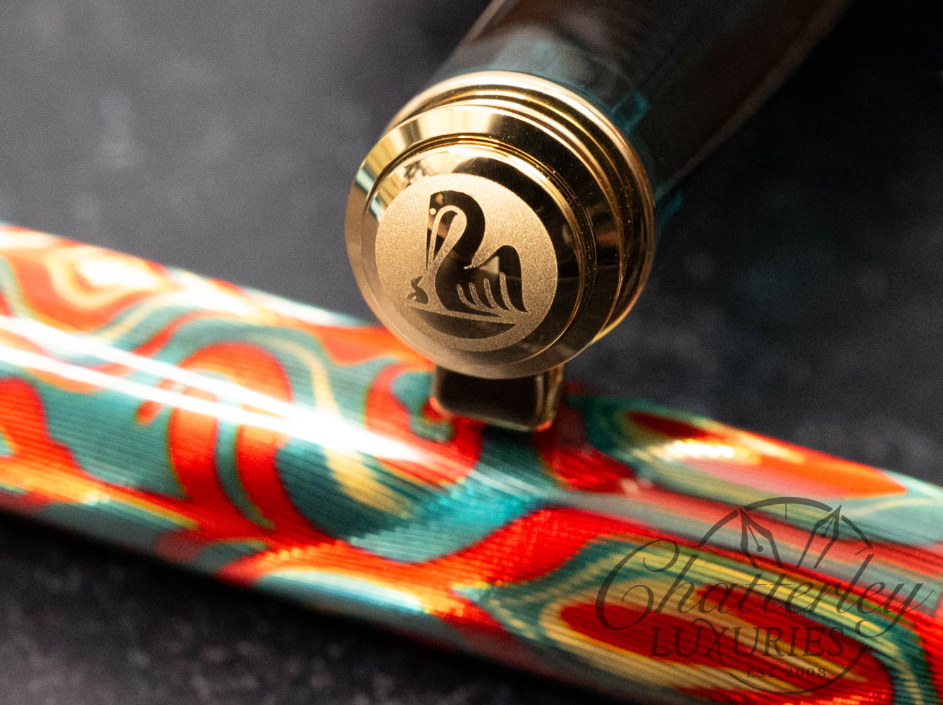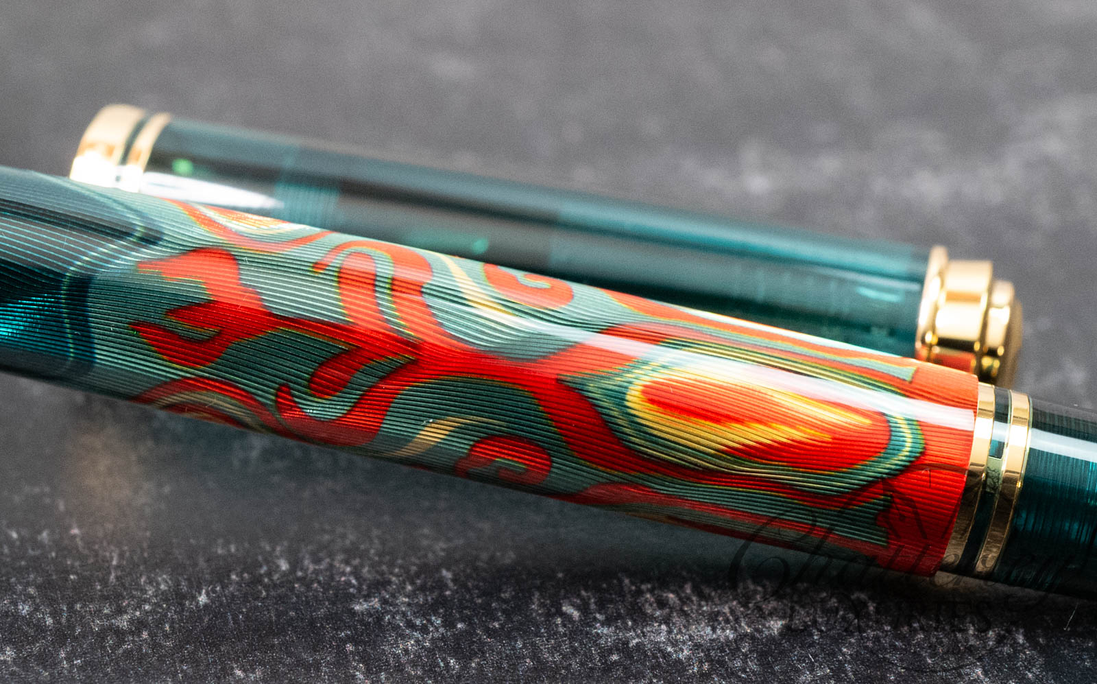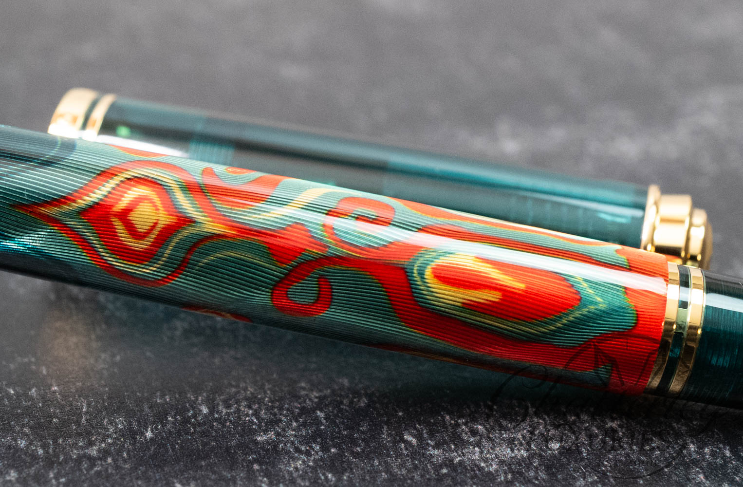The unique appearance of this pen is the result of a multi-step process. The brass barrel material is first engraved and guilloched, creating fine grooves that ultimately achieve a unique light-reflecting holographic effect. Ten layers of lacquer are then applied, and after polishing, the surface is then printed with the colored image motif. Final polishing then accentuates the colors and brings the surface to a high gloss shine.