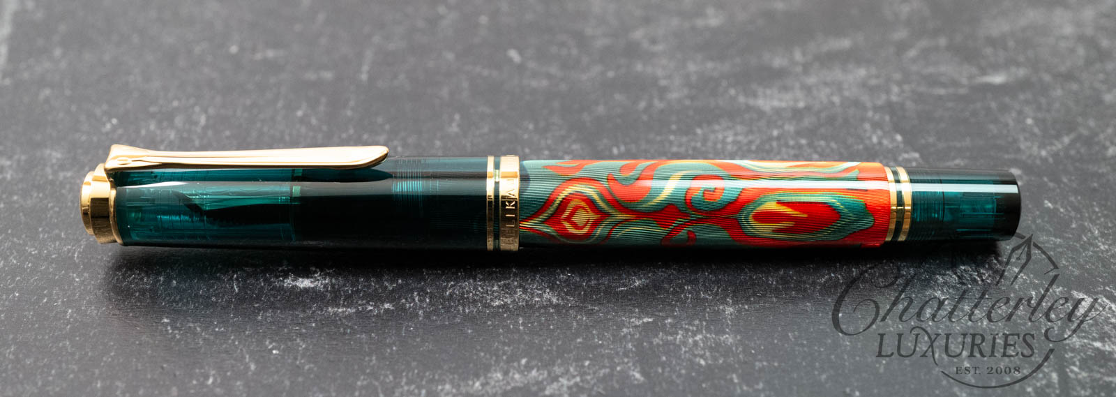 The trim is plated in 24k gold, and Pelikan’s famous differential piston-fill system provides for a high capacity and allows for the use of any bottled fountain pen ink.