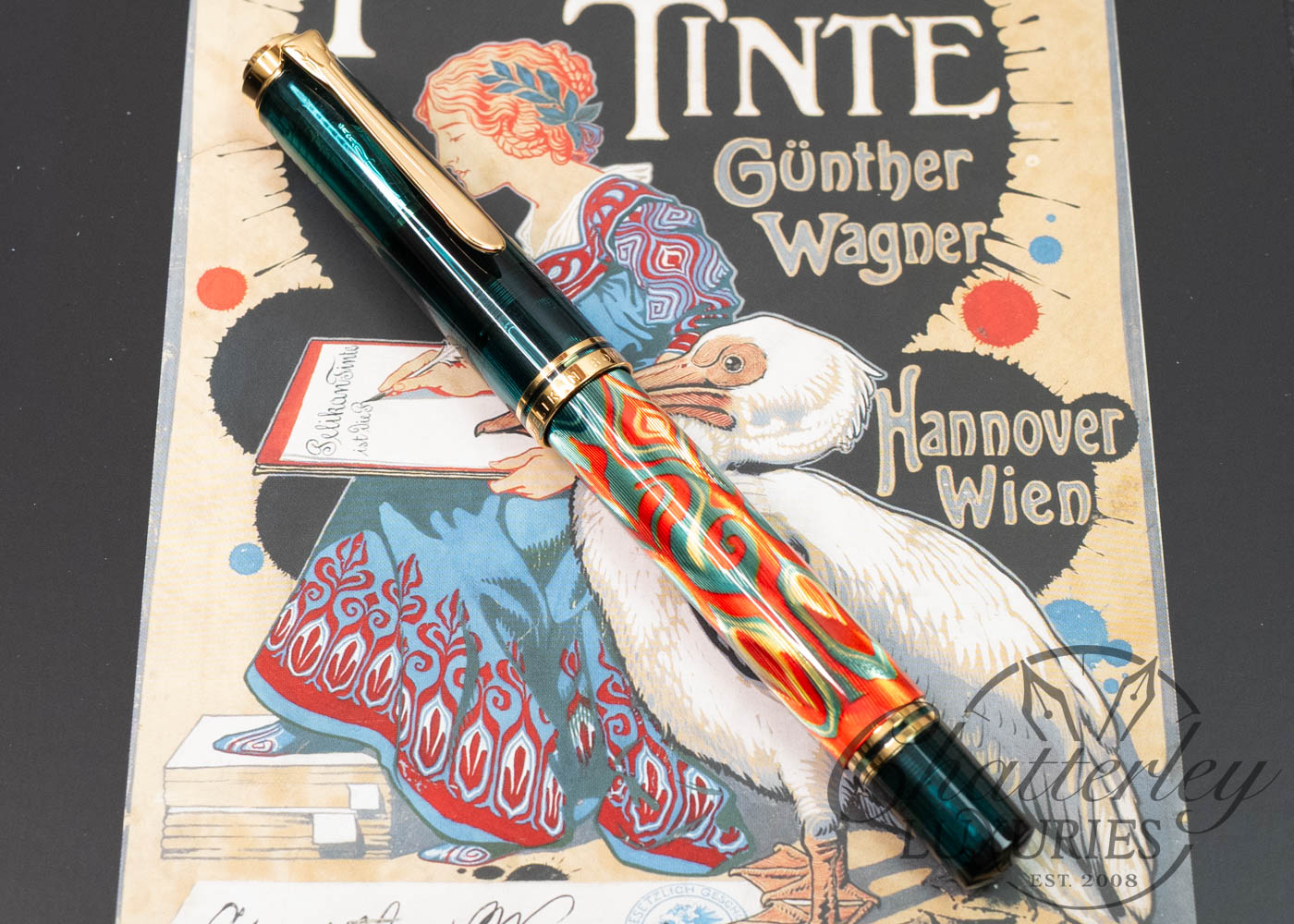 In 1903, he won the coveted annual Pelikan art competition. This was one of Rother’s most significant works which he designed for Pelikan. The woman writing a document next to a pelican depicts a combination of functionalism and aesthetics that is typical of Jugendstil (Germany’s art nouveau movement). Rother’s talent at effectively connecting graphic design and fine art shaped the style of commercial art at the turn of the century. His humorous pen-and-ink illustrations garnered respect particularly in the world of advertising having a decisive influence on commercial art. His work was characterized by flowing lines, ornamental designs, and stylized figures. The pen based off of his design, features an interesting shade of green resin for the section, piston knob, and cap. The barrel takes its inspiration from the pattern in the woman’s dress.