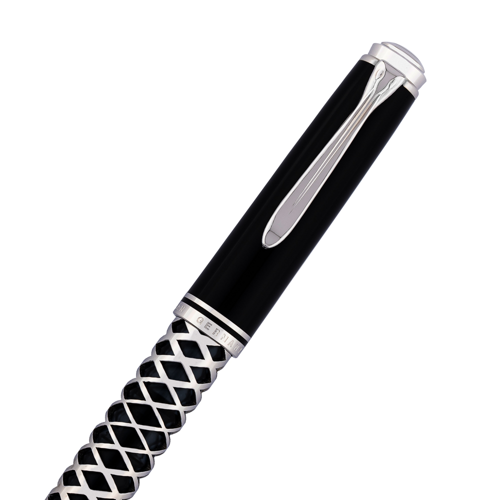 At the core of the M805 Metal Sleeve is a polished black acrylic barrel, expertly fitted with a laser-cut silver metal sleeve. This intricately patterned overlay delivers an exceptional contrast of surfaces—smooth acrylic and detailed metal—giving the pen a bold, geometric look and a unique tactile experience. It’s a statement piece with a modern, industrial edge, designed to stand out.