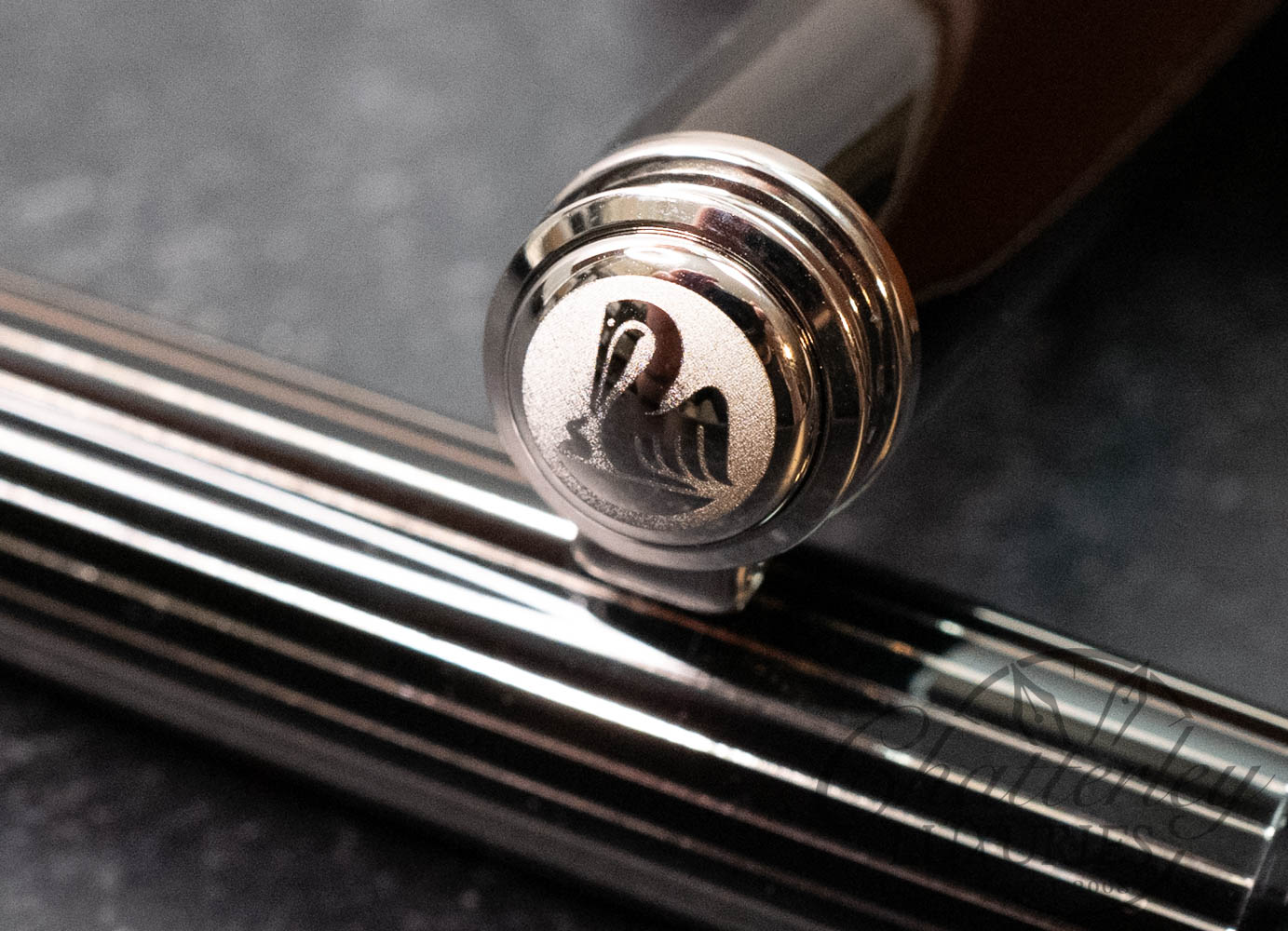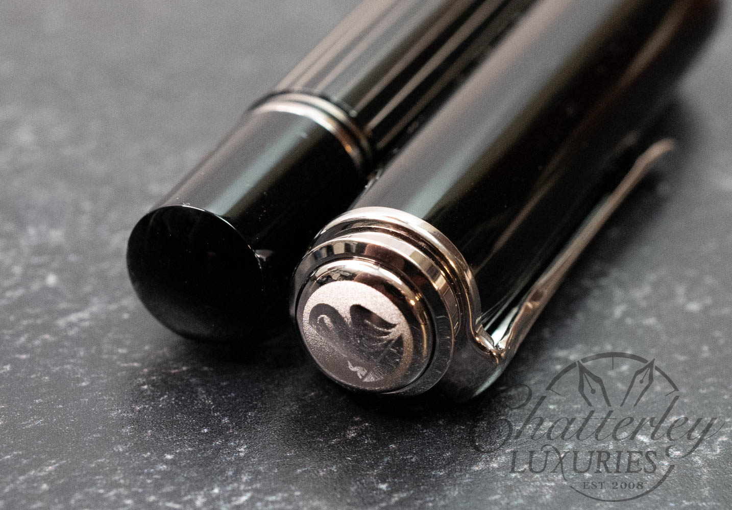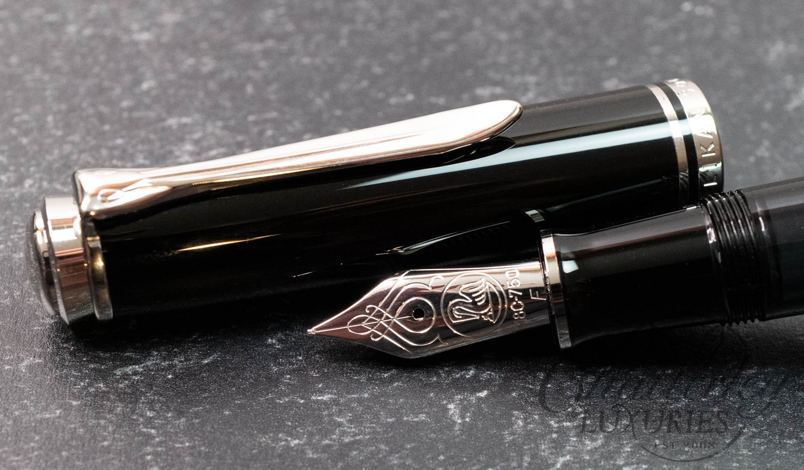 The rings and the clip are palladium plated, and the 18 carat gold nib is completely covered by rhodium in order to obtain the silver sheen. As with most Pelikan pens a variety of nib widths are offered to match your preferred line width and writing style preference. These differential piston fountain pens will be available in nib sizes EF, F, M, and B.