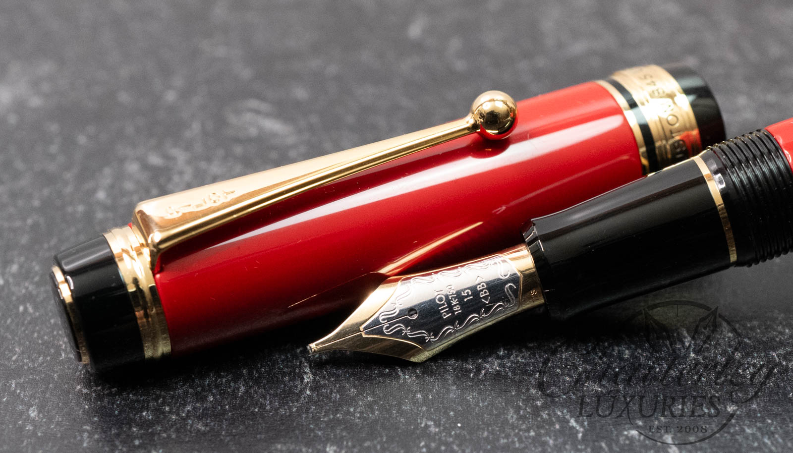 The Custom 845 is extremely popular worldwide because of its unique Urushi lacquer finish, two-toned 18kt gold nib (size #15) and large barrel size. A Pilot Con-70 converter is included.
