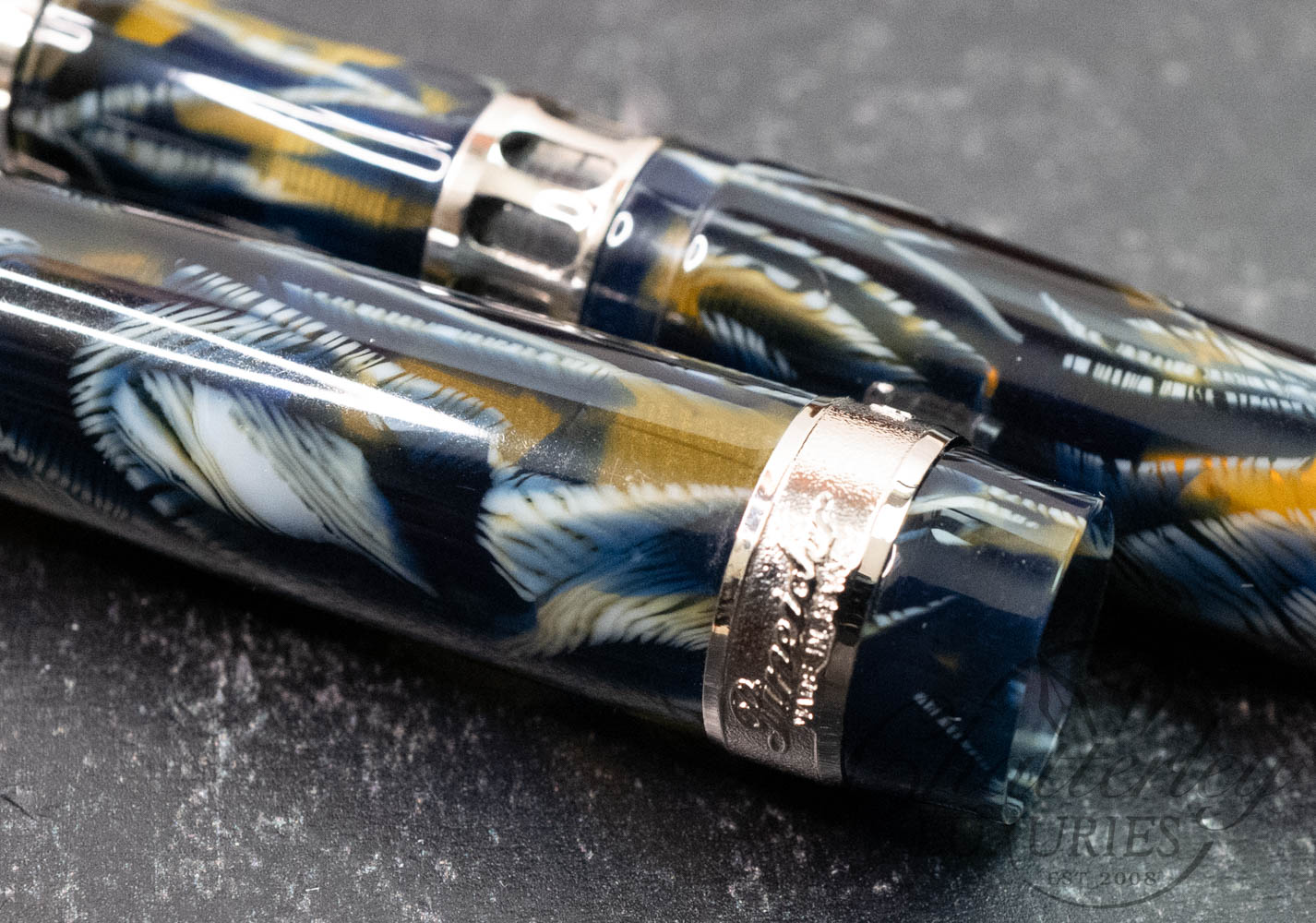 Throughout history, four primary techniques for creating celluloid pens have been recognized in pen literature: spiral wrap (spiral winding), funnel straight (funnel closure), flat mold (two-part seed press), and solid block methods. Certain techniques allowed for material conservation and consistent decorative patterns across the pen’s entire 360 degrees, avoiding a side effect commonly seen in pens carved from solid blocks.