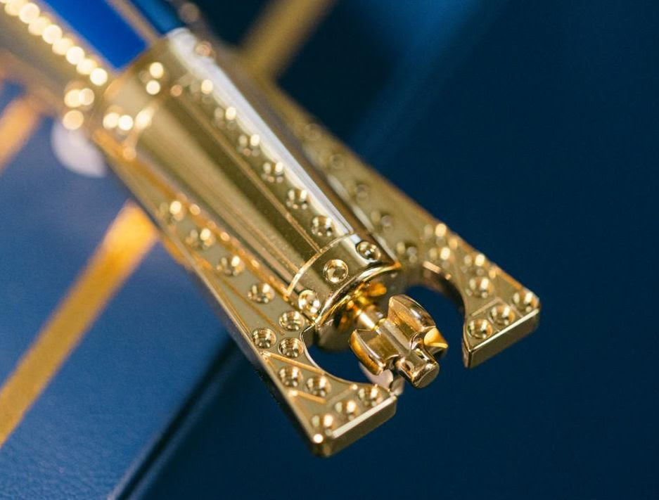 The Writing Kit features the S.T. Dupont Line D Eternity XL pen featuring interchangeable rollerball and fountain pen grip sections. The pen is a deep marine blue and features guilloché engravings animating the famous squid from the novel. The pen has submarine details, with a moving propeller at the base of the pen. Includes Squid pen stand and replica of the Nautilus.