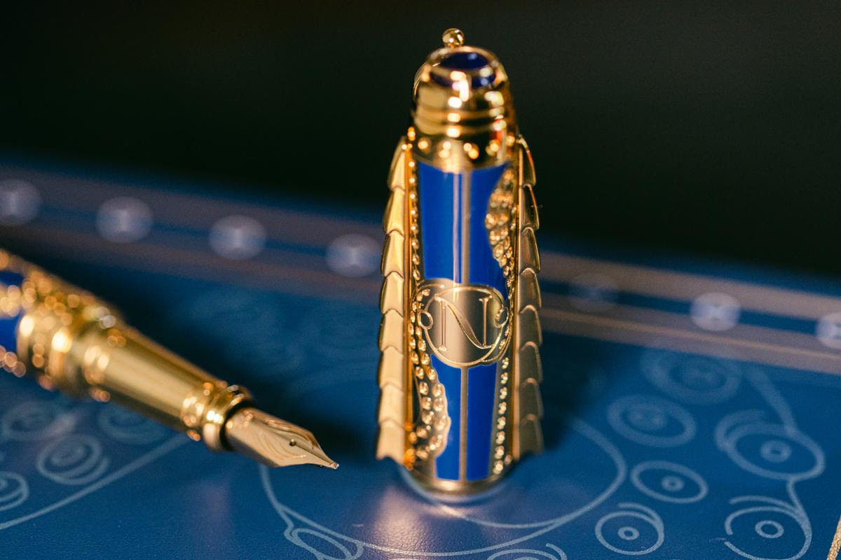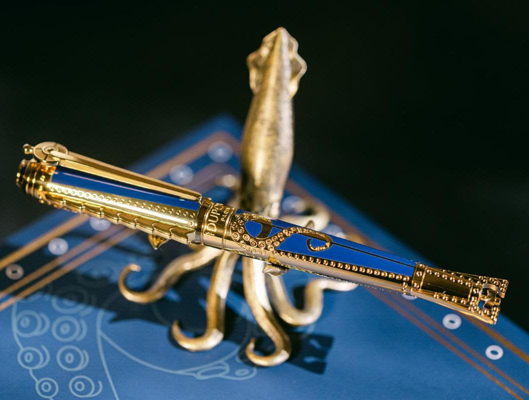 - Shiny blue S.T. Dupont lacquered pen with squid tentacle engraved in gold-finish placed lacquer