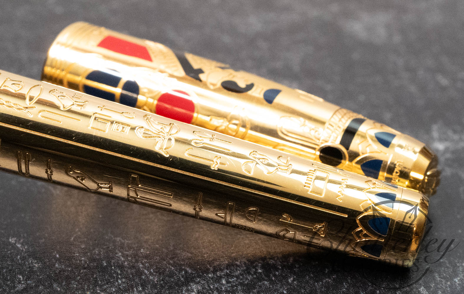 Each piece is crafted with guilloche patterning on gold plated finishes and detailed in red, black and blue Chinese lacquer, as well as a greenish-blue malachite. The carvings on the faces and cornices of the lighters and on the bodies and caps of the pens feature pictorials with hieroglyphic images symbolic of an Egyptian creation myth.