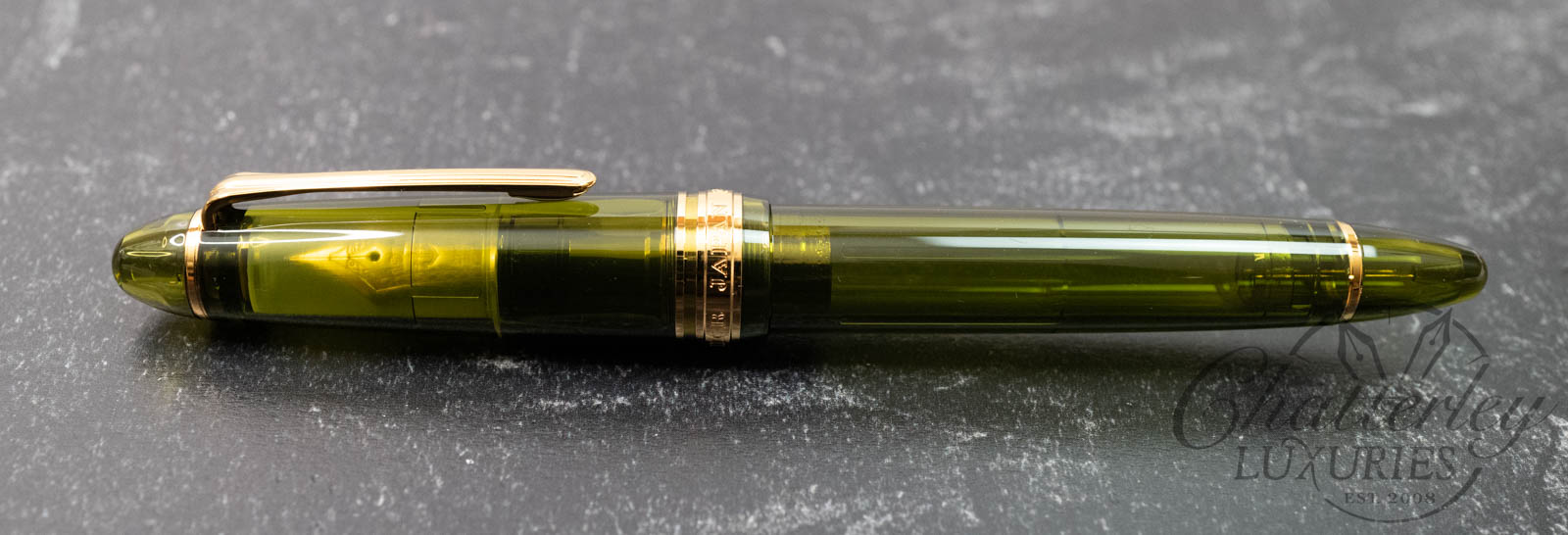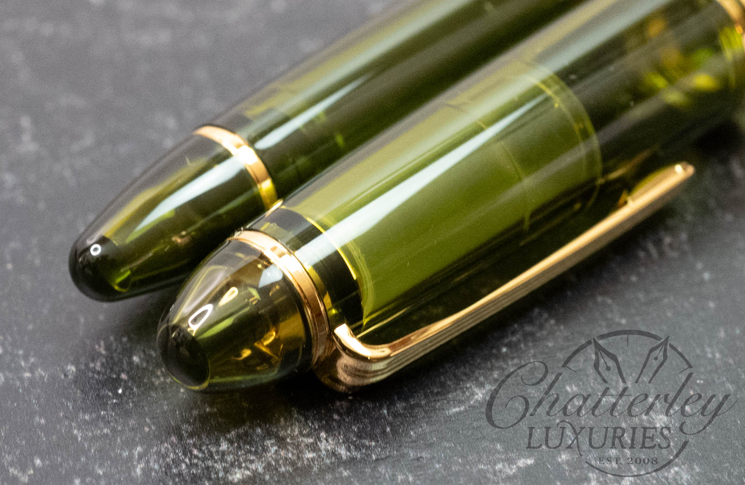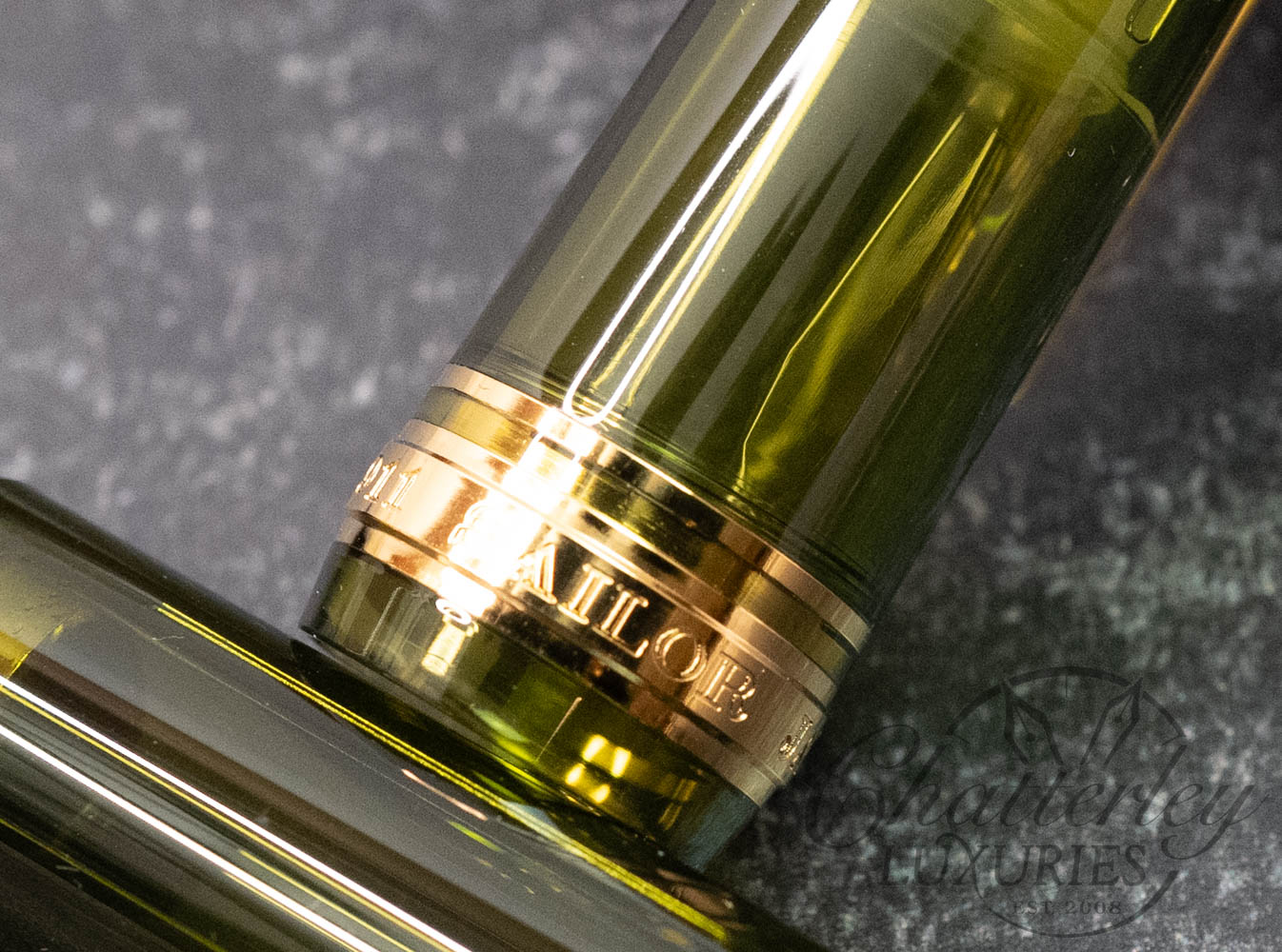 The pen itself has a translucent body and cap in a rich dark green, which besides giving the pen a refined yet contemporary aesthetic, allows you to see the ink remaining in a converter or cartridge without removing the barrel. The trim and nib have a gold finish, which complements the green of the cap and body nicely. Sailor nibs are renowned for their quality and unique feel, and the 21K and 14K nibs on the Large and Standard respectively are no exception