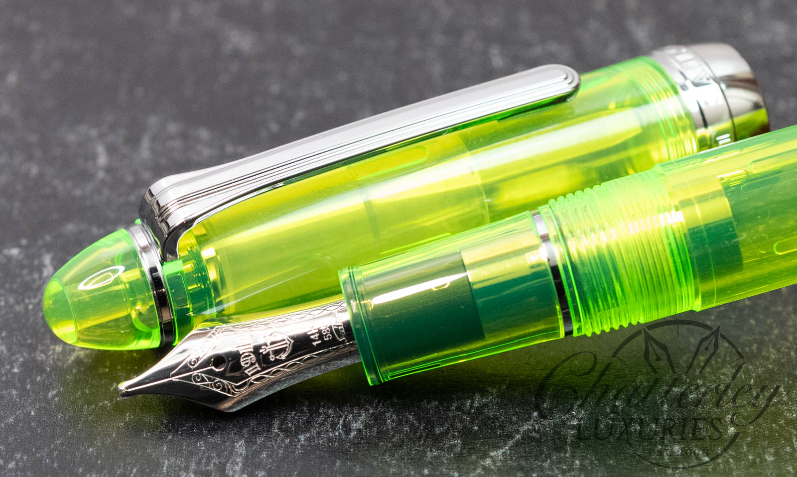 This pen is lovingly used and does not come with a box or papers. It is equipped with a 14k Music nib and fills via a cartridge converter (included).